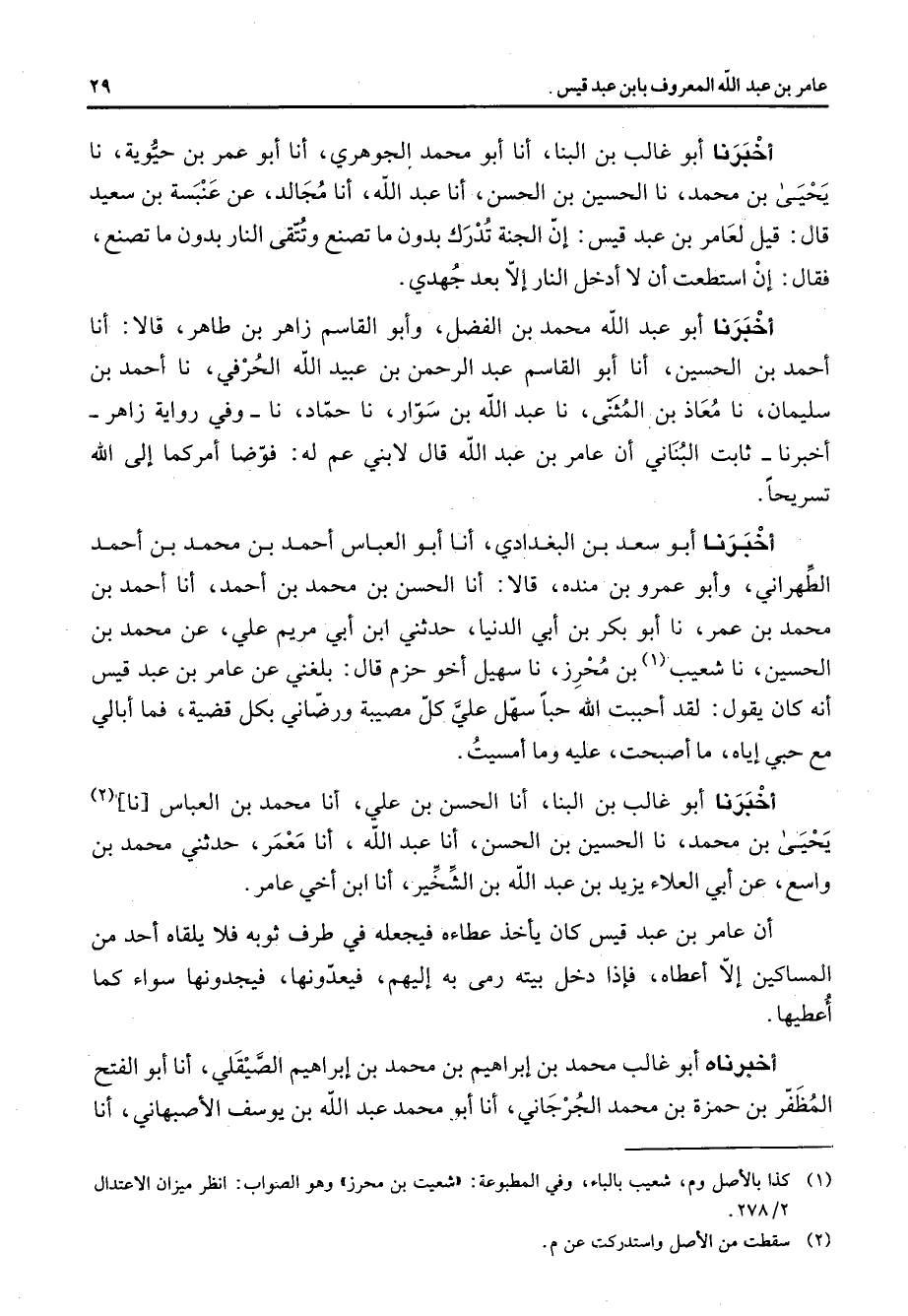 أخبرنا أبو غالب بن البنا أنا أبو محمد الجوهري أنا أبو عمر بن حيوية نا يحيى بن محمد نا الحسين بن الحسن أنا عبد الله أنا مجالد عن عنبسة بن سعيد قال قيل لعامر بن عبد قيس إن الجنة تدرك بدون ما تصنع وتتقى النار بدون ما تصنع فقال إن استطعت أن لا أدخل النار إلا بعد جهدي أخبرنا أبو عبد الله محمد بن الفضل وأبو القاسم زاهر بن طاهر قالا أنا أحمد بن الحسين أنا أبو القاسم عبد الرحمن بن عبيد الله الحرفي نا أحمد بن سليمان نا معاذ بن المثنى نا عبد الله بن سوار نا حماد نا وفي رواية زاهر أخبرنا ثابت البناني أن عامر بن عبد الله قال لابني عم له فوضا أمركما إلى الله تسريحا أخبرنا أبو سعد بن البغدادي أنا أبو العباس أحمد بن محمد بن أحمد الطهراني وأبو عمرو بن منده قالا أنا الحسن بن محمد بن أحمد أنا أحمد بن محمد بن عمر نا أبو بكر بن أبي الدنيا حدثني ابن أبي مريم علي عن محمد بن الحسين نا شعيب (1) بن محرز نا سهيل أخو حزم قال بلغني عن عامر بن عبد قيس أنه كان يقول لقد أحببت الله حبا سهل علي كل مصيبة ورضاني بكل قضية فما أبالي مع حبي إياه ما أصبحت عليه وما أمسيت أخبرنا أبو غالب بن البنا أنا الحسن بن علي أنا محمد بن العباس نا (2) يحيى بن محمد نا الحسين بن الحسن أنا عبد الله أنا معمر حدثني محمد بن واسع عن أبي العلاء يزيد بن عبد الله بن الشخير أنا ابن أخي عامر أن عامر بن عبد قيس كان يأخذ عطاءه فيجعله في طرف ثوبه فلا يلقاه أحد من المساكين إلا أعطاه فإذا دخل بيته رمى به إليهم فيعدونها فيجدونها سواء كما أعطيها أخبرناه أبو غالب محمد بن إبراهيم بن محمد بن إبراهيم الصيقلي أنا أبو الفتح المظفر بن حمزة بن محمد الجرجاني أنا أبو محمد عبد الله بن يوسف الأصبهاني أنا