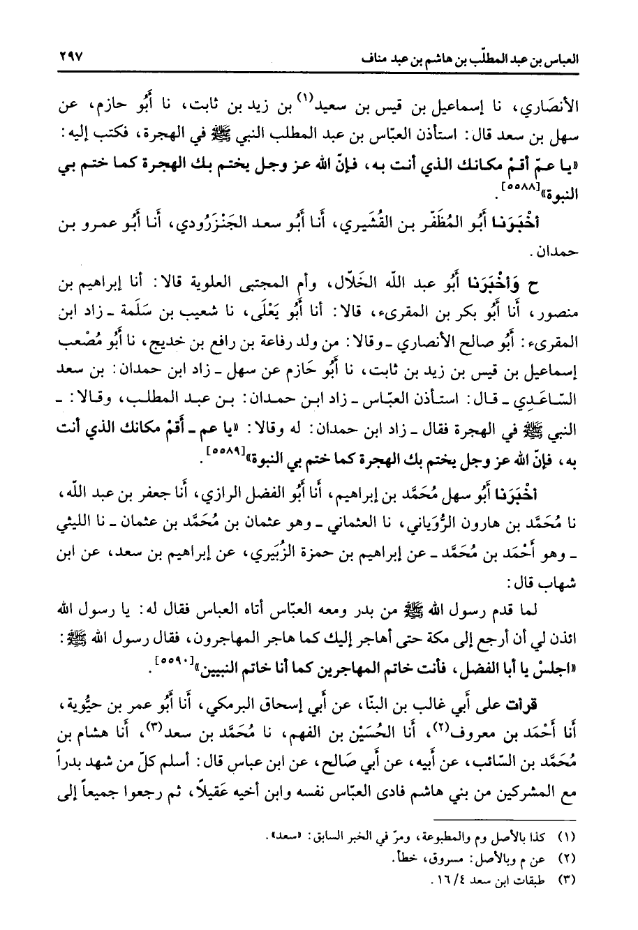 قرأت على أبي غالب بن البنا عن أبي إسحاق البرمكي أنا أبو عمر بن حيوية أنا أحمد بن معروف (2) أنا الحسين بن الفهم نا محمد بن سعد (3) أنا هشام بن محمد بن السائب عن أبيه عن أبي صالح عن ابن عباس قال أسلم كل من شهد بدرا مع المشركين من بني فادى العباس نفسه وابن أخيه عقيلا ثم رجعوا جميعا إلى