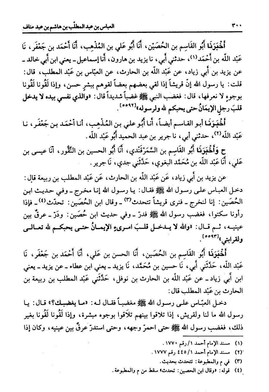 * أخبرنا أبو القاسم بن الحصين أنا أبو علي بن المذهب أنا أحمد بن جعفر نا عبد الله بن أحمد (1) حدثني أبي نا يزيد بن هارون أنا إسماعيل يعني ابن أبي خالد عن يزيد بن أبي زياد عن عبد الله بن الحارث عن العباس بن عبد المطلب قال قلت يا رسول الله إن قريشا إذا لقي بعضهم بعضا لقوهم ببشر حسن وإذا لقونا لقونا بوجوه لا نعرفها قال فغضب النبي (صلى الله عليه وسلم) غضبا شديدا قال والذي نفسي بيده لا يدخل قلب رجل الإيمان حتى يحبكم لله ولرسوله