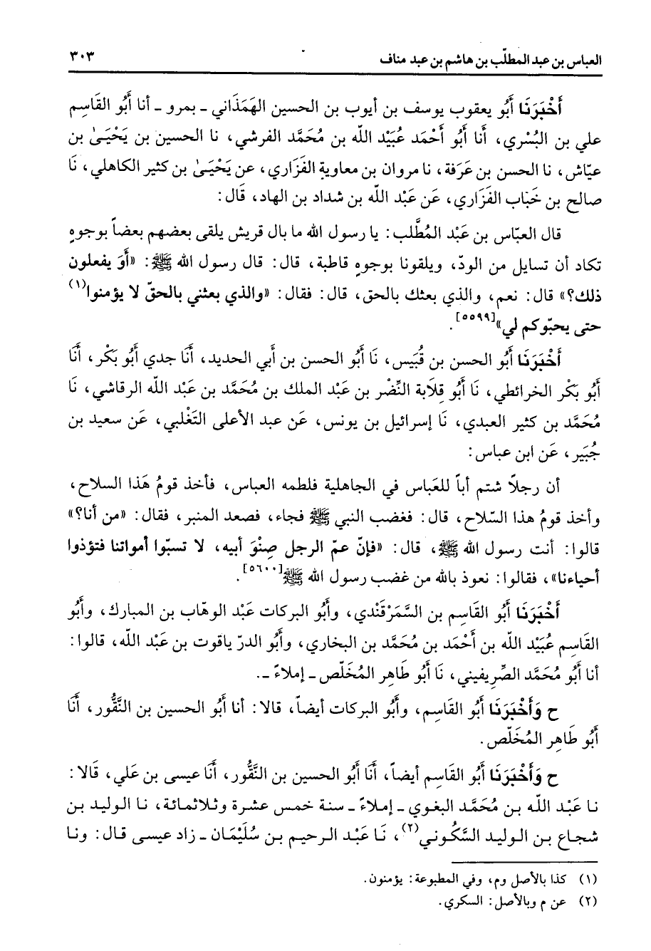 أخبرنا أبو يعقوب يوسف بن أيوب بن الحسين الهمذاني بمرو أنا أبو القاسم علي بن البسري أنا أبو أحمد عبيد الله بن محمد الفرشي نا الحسين بن يحيى بن عياش نا الحسن بن عرفة نا مروان بن معاوية الفزاري عن يحيى بن كثير الكاهلي نا صالح بن خباب الفزاري عن عبد الله بن شداد بن الهاد قال قال العباس بن عبد المطلب يا رسول الله ما بال قريش يلقى بعضهم بعضا بوجوه تكاد أن تسايل من الود ويلقونا بوجوه قاطبة قال قال رسول الله (صلى الله عليه وسلم) أو يفعلون ذلك قال نعم والذي بعثك بالحق قال فقال والذي بعثني بالحق لا يؤمنوا (1) حتى يحبوكم لي