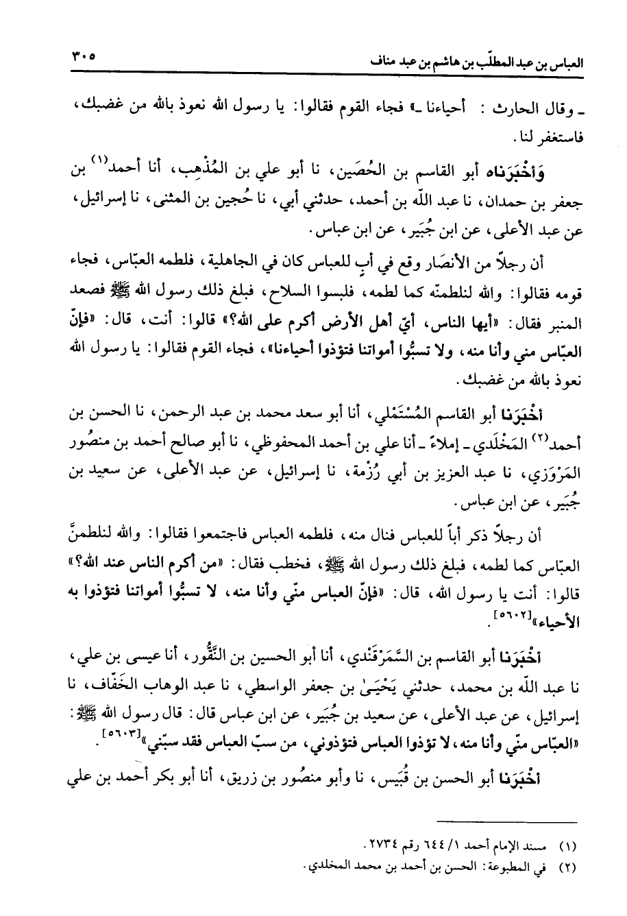 وقال الحارث أحياءنا فجاء القوم فقالوا يا رسول الله نعوذ بالله من غضبك فاستغفر لنا وأخبرناه أبو القاسم بن الحصين نا أبو علي بن المذهب أنا أحمد (1) بن جعفر بن حمدان نا عبد الله بن أحمد حدثني أبي نا حجين بن المثنى نا إسرائيل عن عبد الأعلى عن ابن جبير عن ابن عباس أن رجلا من الأنصار وقع في أبل للعباس كان في الجاهلية فلطمه العباس فجاء قومه فقالوا والله لنلطمنه كما لطمه فلبسوا السلاح فبلغ ذلك رسول الله (صلى الله عليه وسلم) فصعد المنبر فقال أيها الناس أي أهل الأرض أكرم على الله قالوا أنت قال فإن العباس مني وأنا منه ولا تسبوا أمواتنا فتؤذوا أحياءنا فجاء القوم فقالوا يا رسول الله نعوذ بالله من غضبك أخبرنا أبو القاسم المستملي أنا أبو سعد محمد بن عبد الرحمن نا الحسن بن أحمد (2) المخلدي إملاء أنا علي بن أحمد المحفوظي نا أبو صالح أحمد بن منصور المروزي نا عبد العزيز بن أبي رزمة نا إسرائيل عن عبد الأعلى عن سعيد بن جبير عن ابن عباس أن رجلا ذكر أبا للعباس فنال منه فلطمه العباس فاجتمعوا فقالوا والله لنلطمن العباس كما لطمه فبلغ ذلك رسول الله (صلى الله عليه وسلم) فخطب فقال من أكرم الناس عند الله قالوا أنت يا رسول الله قال فإن العباس مني وأنا منه لا تسبوا أمواتنا فتؤذوا به الأحياء