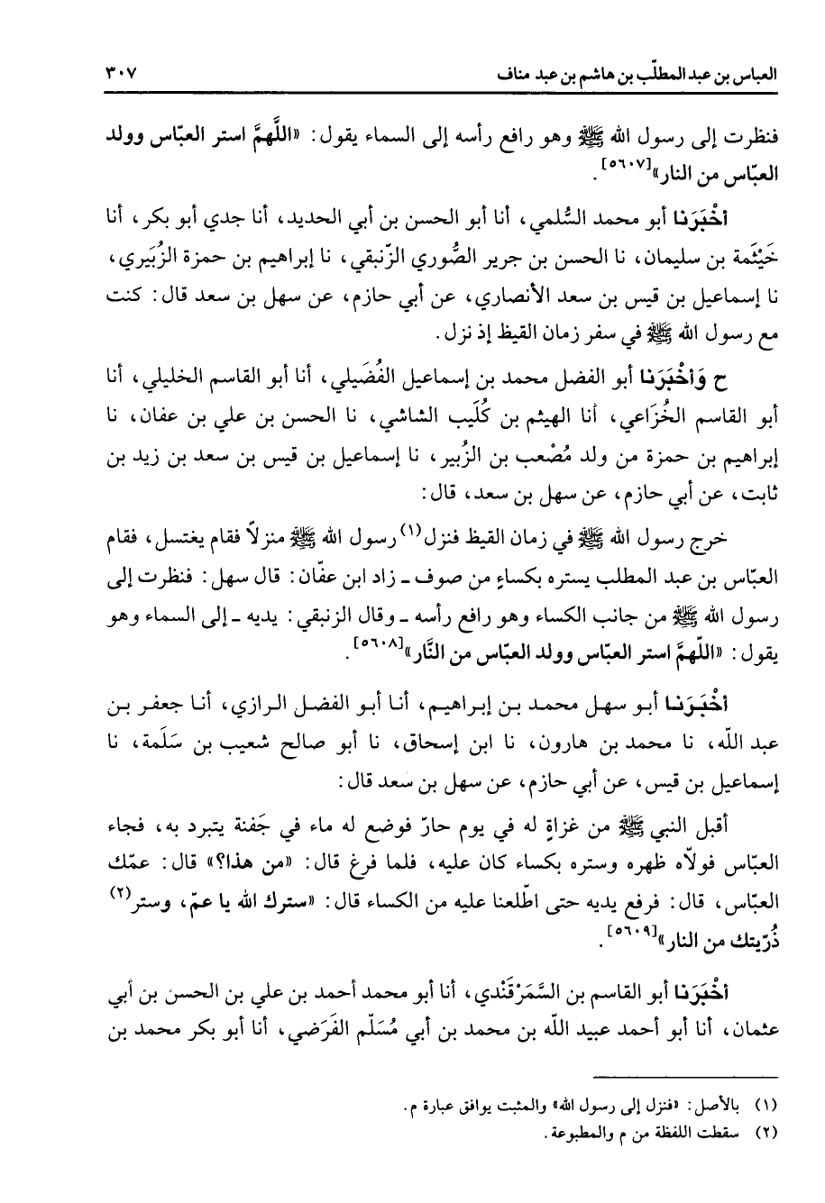 [5607] أخبرنا أبو محمد السلمي أنا أبو الحسن بن أبي الحديد أنا جدي أبو بكر أنا خيثمة بن سليمان نا الحسن بن جرير الصوري الزنبقي نا إبراهيم بن حمزة الزبيري نا إسماعيل بن قيس بن سعد الأنصاري عن أبي حازم عن سهل بن سعد قال كنت مع رسول الله (صلى الله عليه وسلم) في سفرزمان القيظ إذ نزل ح وأخبرنا أبو الفضل محمد بن إسماعيل الفضيلي أنا أبو القاسم الخليلي أنا أبو القاسم الخزاعي أنا الهيثم بن كليب الشاشي نا الحسن بن علي بن عفان نا إبراهيم بن حمزة من ولد مصعب بن الزبير نا إسماعيل بن قيس بن سعد بن زيد بن ثابت عن أبي حازم عن سهل بن سعد قال خرج رسول الله (صلى الله عليه وسلم) في زمان القيظ فنزل (1) رسول الله (صلى الله عليه وسلم) منزلا فقام يغتسل فقام العباس بن بعد المطلب يستره بكساء من صوف زاد ابن عفان قال سهل فنظرت إلى رسول الله (صلى الله عليه وسلم) من جانب الكساء وهو رافع رأسه وقال الزنبقي يديه إلى السماء وهو يقول اللهم استر العباس وولد العباس من النار