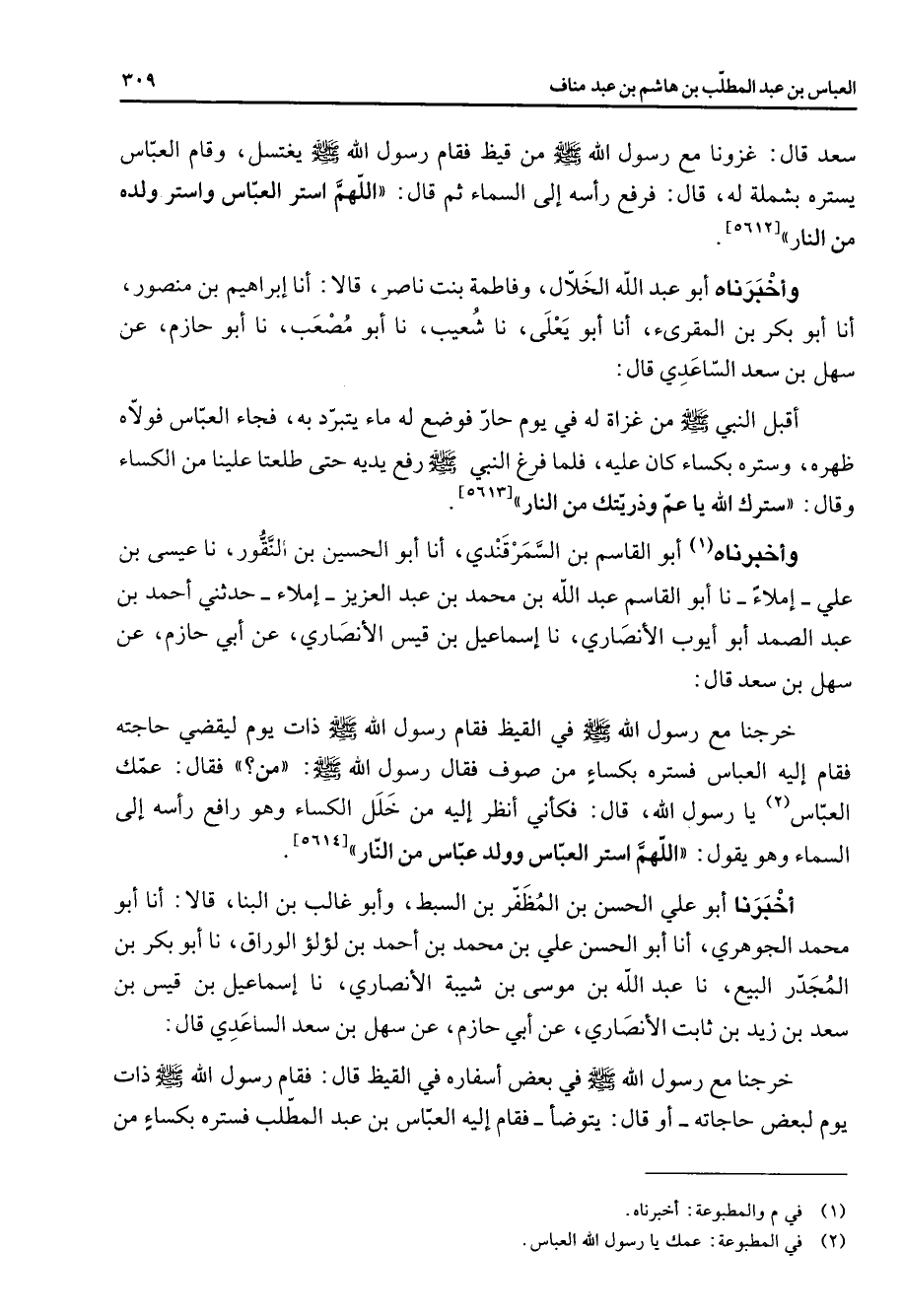 [5612] وأخبرناه أبو عبد الله الخلال وفاطمة بنت ناصر قالا أنا إبراهيم بن منصور أنا أبو بكر بن المقرئ أنا أبو يعلى نا شعيب نا أبو مصعب نا أبو حازم عن سهل بن سعد الساعدي قال أقبل النبي (صلى الله عليه وسلم) من غزاة له في يوم حار فوضع له ماء يتبرد به فجاء العباس فولاه ظهره وستره بكساء كان عليه فلما فرغ النبي (صلى الله عليه وسلم) رفع يديه حتى طلعتا علينا من الكساء وقال سترك الله يا عم وذريتك من النار