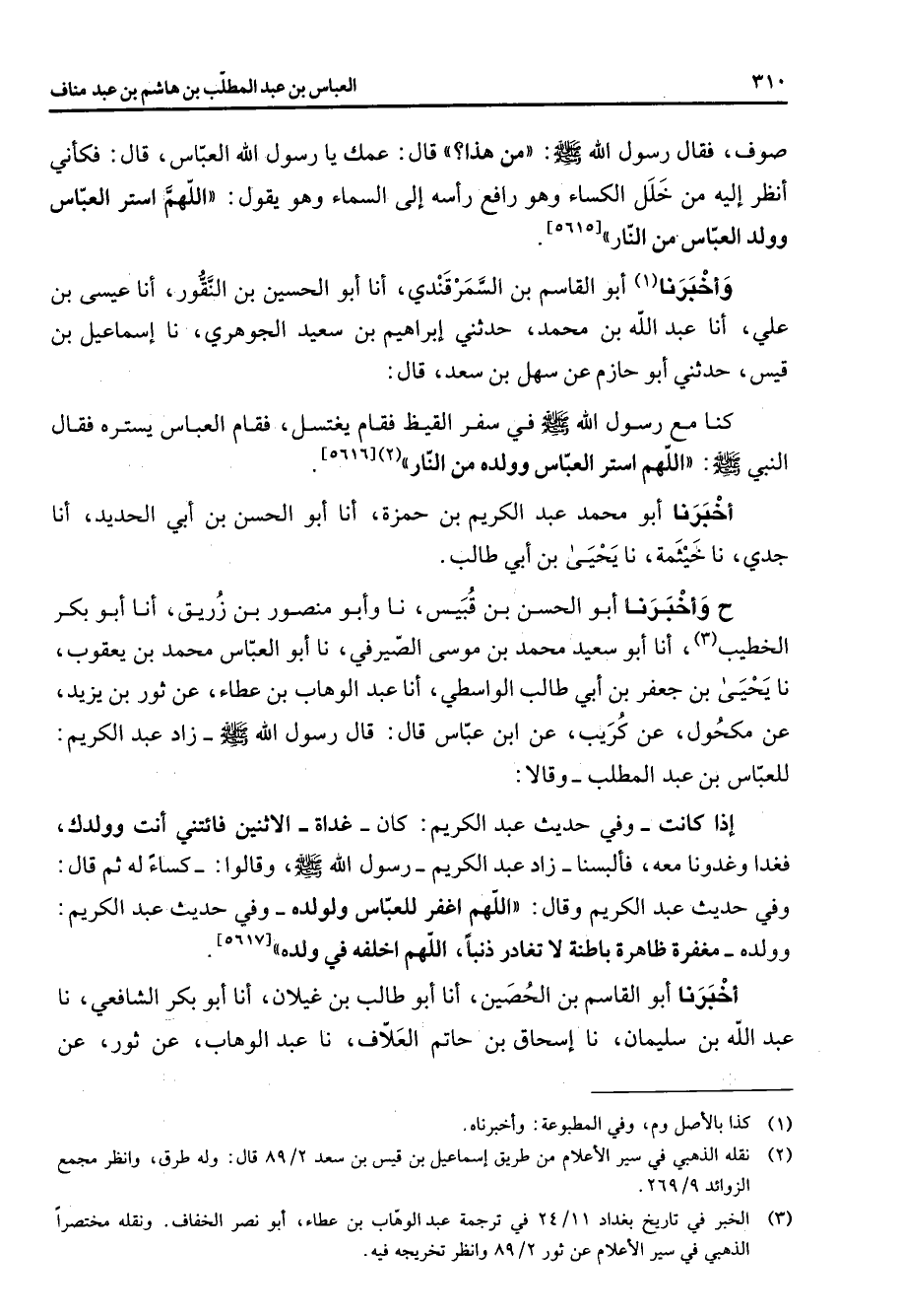 [5616] أخبرنا أبو محمد عبد الكريم بن حمزة أنا أبو الحسن بن أبي الحديد أنا جدي نا خيثمة نا يحيى بن أبي طالب ح وأخبرنا أبو الحسن بن قبيس نا وأبو منصور بن زريق أنا أبو بكر الخطيب (3) أنا أبو سعيد محمد بن موسى الصيرفي نا أبو العباس محمد بن يعقوب نا يحيى بن جعفر بن أبي طالب الواسطي أنا عبد الوهاب بن عطاء عن ثور بن يزيد عن مكحول عن كريب عن ابن عباس قال قال رسول الله (صلى الله عليه وسلم) زاد عبد الكريم للعباس بن عبد المطلب وقالا إذا كانت وفي حديث عبد الكريم كان غداة الاثنين فائتني أنت وولدك فغدا وغدونا معه فألبسنا زاد عبد الكريم رسول الله (صلى الله عليه وسلم) وقالوا كساء له ثم قال وفي حديث عبد الكريم وقال اللهم اغفر للعباس ولولده وفي حديث عبد الكريم وولده مغفرة ظاهرة باطنة لا تغادر ذنبا اللهم اخلفه في ولده