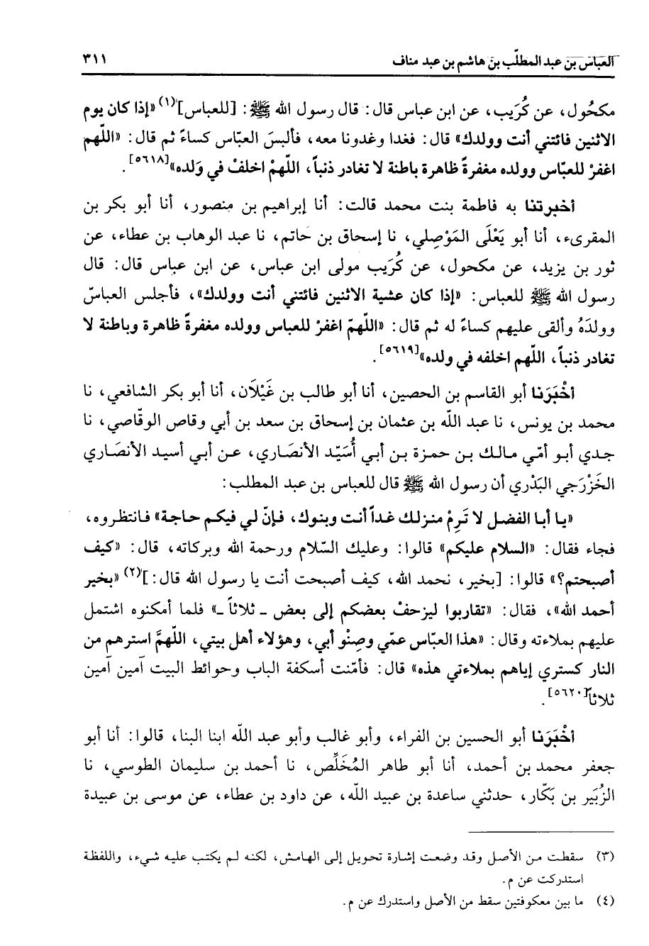[5618] أخبرتنا به فاطمة بنت محمد قالت أنا إبراهيم بن منصور أنا أبو بكر بن المقرئ أنا أبو يعلى الموصلي نا إسحاق بن حاتم نا عبد الوهاب بن عطاء عن ثور بن يزيد عن مكحول عن كريب مولى ابن عباس عن ابن عباس قال قال رسول الله (صلى الله عليه وسلم) لعباس إذا كان عشية الاثنين فائتني أنت وولدك فأجلس العباس وولده وألقى عليهم كساء له ثم قال اللهم اغفر للعباس وولده مغفرة ظاهرة وباطنة لا تغادر ذنبا اللهم اخلفه في ولده
