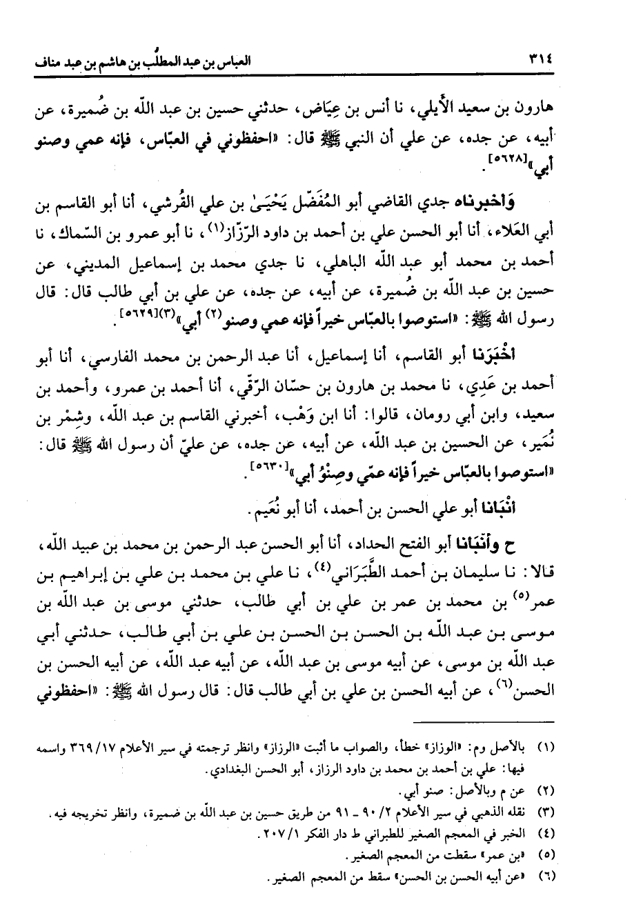 [5628] وأخبرناه جدي القاضي أبو المفضل يحيى بن علي القرشي أنا أبو القاسم بن أبي العلاء أنا أبو الحسن علي بن أحمد بن داود الرزاز (1) نا أبو عمرو بن السماك نا أحمد بن محمد أبو عبد الله الباهلي نا جدي محمد بن إسماعيل المديني عن حسين بن عبد الله بن ضميرة عن أبيه عن جده عن علي بن أبي طالب قال قال رسول الله (صلى الله عليه وسلم) استوصوا بالعباس خيرا فإنه عمي وصنو (2) أبي (3)