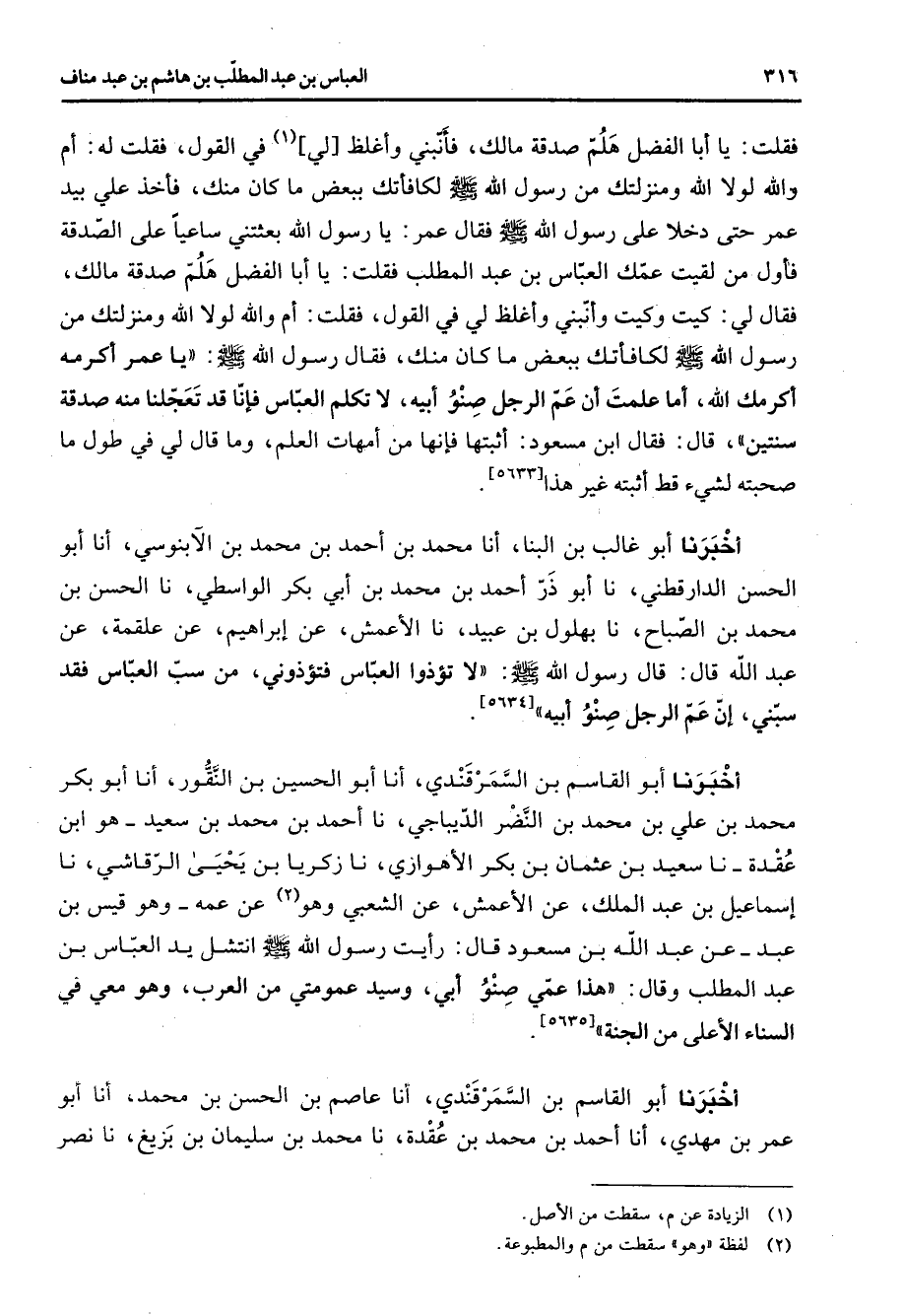 فقلت يا أبا الفضل هلم صدقة مالك فأنبني وأغلظ لي (1) في القول فقلت له أم والله لولا الله ومنزلتك من رسول الله (صلى الله عليه وسلم) لكافأتك ببعض ما كان منك فأخذ علي بيد عمر حتدخلا على رسول الله (صلى الله عليه وسلم) فقال عمر يا رسول الله بعثتني ساعيا على الصدقة فأول من لقيت عمك العباس بن عبد المطلب فقلت يا أبا الفضل هلم صدقة مالك فقال لي كيت وكيت وأنبني وأغلظ لي في القول فقلت أم والله لولا الله ومنزلتك من رسول الله (صلى الله عليه وسلم) لكافأتك ببعض ما كان منك فقال رسول الله (صلى الله عليه وسلم) يا عمر أكرمه أكرمك الله أما علمت أن عم الرجل صنو أبيه لا تكلم العباس فإنا قد تعجلنا منه صدقة سنتين قال فقال ابن مسعود أثبتها فإنها من أمهات العلم وما قال لي في طول ما صحبته لشئ قط أثبته غير هذا