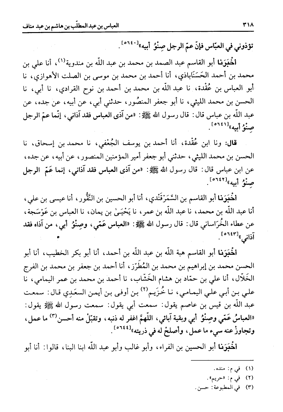 [5640] أخبرنا أبو القاسم عبد الصمد بن محمد بن عبد الله بن مندوية (1) أنا علي بن محمد بن أحمد الحسناباذي أنا أحمد بن محمد بن موسى بن الصلت الأهوازي نا أبو العباس بن عقدة نا عبد الله بن محمد بن أحمد بن نوح القرادي نا أبي نا الحسن بن محمد الليثي نا أبو جعفر المنصور حدثني أبي عن أبيه عن جده عن عبد الله بن عباس قال قال رسول الله (صلى الله عليه وسلم) من آذى العباس فقد آذاني إنما عم الرجل صنو أبيه