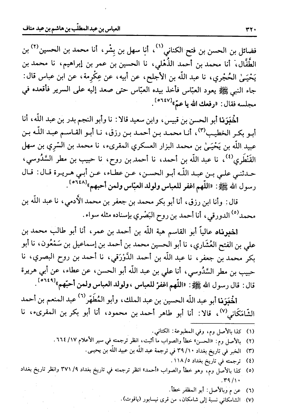 [5647] أخبرنا أبو الحسن بن قبيس وابن سعيد قالا نا وأبو النجم بدر بن عبد الله أنا أبو بكر الخطيب (3) أنا محمد بن أحمد بن رزق نا أبو القاسم عبد الله بن عبيد الله بن يحيى بن محمد البزار العسكري المقرئ نا محمد بن السري بن سهل القنطري (4) نا عبد الله بن أحمد نا أحمد بن روح نا حبيب بن مطر السدوسي حدثني علي بن عبد الله أبو الحسن عن عطاء عن أبي هريرة قال قال رسول الله (صلى الله عليه وسلم) اللهم اغفر للعباس ولولد العباس ولمن أحبهم