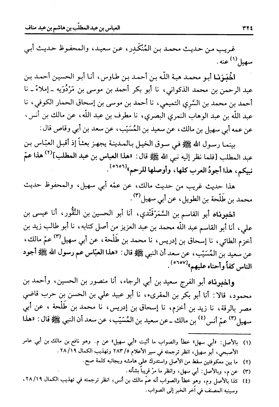غريب من حديث محمد بن المنكدر عن سعيد والمحفوظ حديث أبي سهيل (1) عنه أخبرنا أبو محمد هبة الله بن أحمد بن طاوس أنا أبو الحسين أحمد بن عبد الرحمن بن محمد الذكواني نا أبو بكر أحمد بن موسى بن مردويه إملاء نا أحمد بن محمد بن السري التميمي نا أحمد بن موسى بن إسحاق الحمار الكوفي نا عبد الله بن عبد الوهاب النمري البصري نا مطرف بن عبد الله عن مالك بن أنس عن عمه أبي سهيل بن مالك عن سعيد بن المسيب عن سعد بن أبي وقاص قال بينما رسو الله (صلى الله عليه وسلم) في سوق الخيل بالمدينة يجهز بعثا إذ أقبل العباس بن عبد المطلب فلما نظر إليه نبي الله (صلى الله عليه وسلم) قال هذا العباس بن عبد المطلب (2) هذا عم نبيكم هذا أجود العرب كلها وأوصلها للرحم