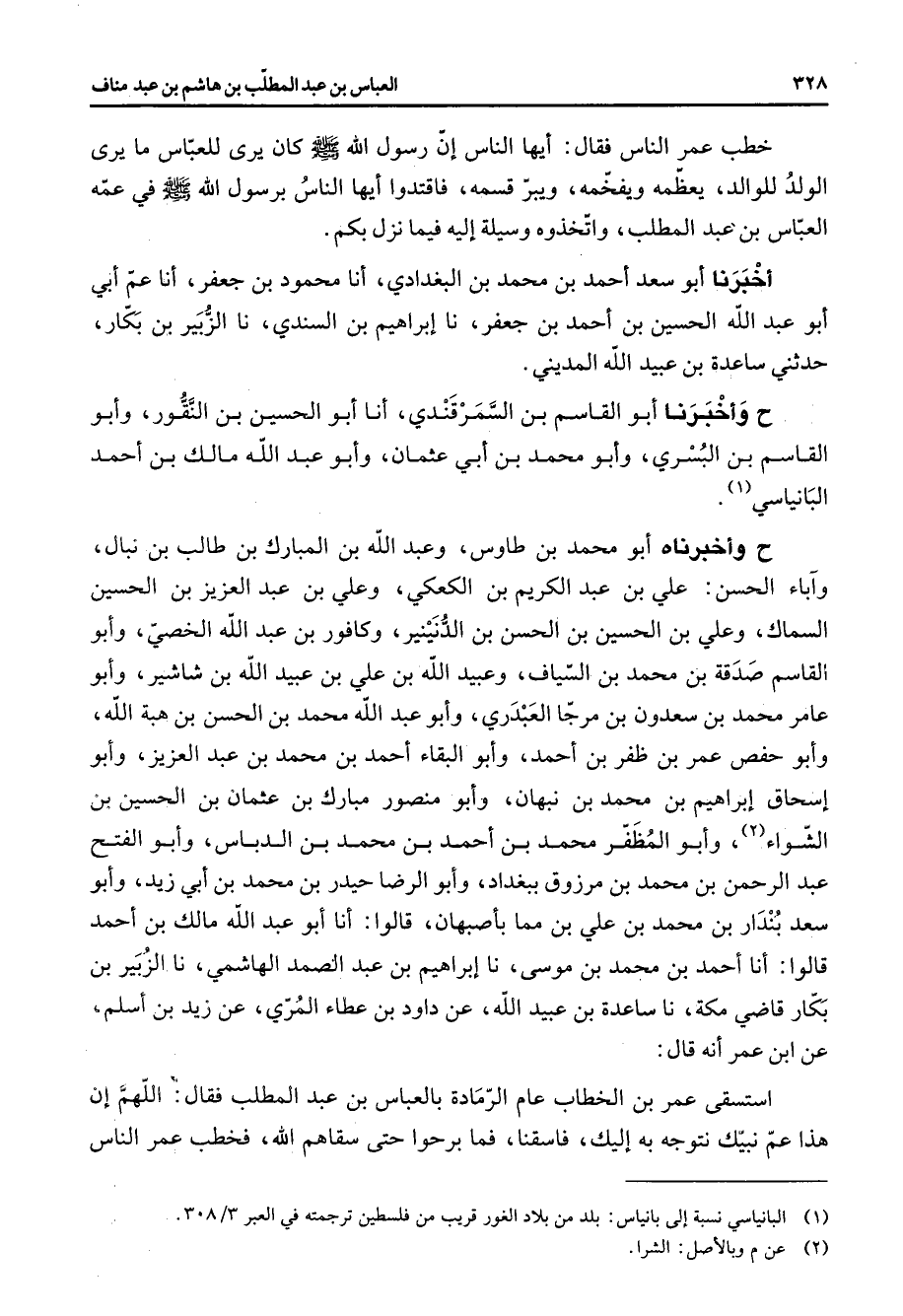خطب عمر الناس فقال أيها الناس إن رسول الله (صلى الله عليه وسلم) كان يرى للعباس ما يرى الولد للوالد يعظمه ويفخمه ويبر قسمه فاقتدوا أيها الناس برسول الله (صلى اللهعليه وسلم) في عمه العباس بن عبد المطلب واتخذوه وسيلة إليه فيما نزل بكم أخبرنا أبو سعد أحمد بن محمد بن البغدادي أنا محمود بن جعفر أنا عم أبي أبو عبد الله الحسين بن أحمد بن جعفر نا إبراهيم بن السندي نا الزبير بن بكار حدثني ساعدة بن عبيد الله المديني ح وأخبرنا أبو القاسم بن السمرقندي أنا أبو الحسين بن النقور وأبو القاسم بن البسري وأبو محمد بن أبي عثمان وأبو عبد الله مالك بن أحمد البانياسي ح وأخبرناه أبو محمد بن طاوس وعبد الله بن المبارك بن طالب بن نبال وآباء الحسن علي بن عبد الكريم بن الكعكي وعلي بن عبد العزيز بن الحسين السماك وعلي بن الحسين بن الحسن بن الدنينير وكافور بن عبد الله الخصي وأب القاسم صدقة بن محمد بن السياف وعبيد الله بن علي بن عبيد الله بن شاشير وأبو عامر محمد بن سعدون بن مرجا العبدري وأبو عبد الله محمد بن الحسن بن هبة الله وأبو حفص عمر بن ظفر بن أحمد وأبو البقاء أحمد بن محمد بن عبد العزيز وأبو إسحاق إبراهيم بن محمد بن نبهان وأبو منصور مبارك بن عثمان بن الحسين بن الشواء (2) وأبو المظفر محمد بن أحمد بن محمد بن الدباس وأبو الفتح عبد الرحمن بن محمد بن مرزوق ببغداد وأبو الرضا حيدر بن محمد بن أبي زيد وأبو سعد بندار بن محمد بن علي بن مما بأصبهان قالوا أنا أبو عبد الله مالك بن أحمد قالوا أنا أحمد بن محمد بن موسى نا إبراهيم بن عبد الصمد الهاشمي نا الزبير بن بكار قاضي مكة نا ساعدة بن عبيد الله عن داود بن عطاء المري عن زيد بن أسلم عن ابن عمر أنه قال استسقى عمر بن الخطاب عام الرمادة بالعباس بن عبد المطلب فقال اللهم إن هذا عم نبيك نتوجه به إليك فاسقنا فما برحوا حتى سقاهم فخطب عمر الناس