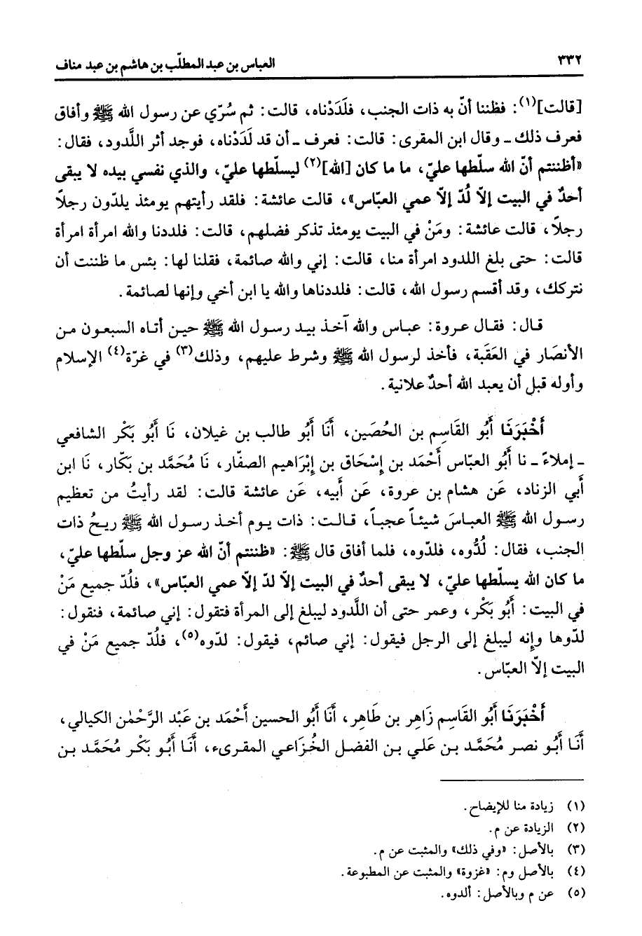 قالت (1) فظننا أن به ذات الجنب فلددناه قالت ثم سري عن رسول الله (صلى اللهعليه وسلم) وأفاق فعرف ذلك وقال ابن المقرى قالت فعرف أن قد لددناه فوجدأثر اللدود فقال أظننتم أن الله سلطها علي ما ما كان الله (2) ليسلطها علي والذي نفسي بيده لا يبقى أحد في البيت إلا لد إلا عمي العباس قالت عائشة فلقد رأيتهم يومئذ يلدون رجلا رجلا قالت عائشة ومن في البيت يومئذ تذكر فضلهم قالت فلددنا والله امرأة امرأة قالت حتى بلغ اللدود امرأة منا قالت إني والله صائمة فقلنا لها بئس ما ظننت أن نتركك وقد أقسم رسول الله قالت فلددناها والله يا ابن أخي وإنها لصائمة قال فقال عروة عباس والله آخذ بيد رسول الله (صلى الله عليه وسلم) حين أتاه السبعون من الأنصار في العقبة فأخذ لرسول الله (صلى الله عليه وسلم) وشرط عليهم وذلك (3) في غرة (4) الإسلام وأوله قبل أن يعبد الله أحد علانية أخبرنا أبو القاسم بن الحصين أنا أبو طالب بن غيلان نا أبو بكر الشافعي إملاء نا أبو العباس أحمد بن إسحاق بن إبراهيم الصفار نا محمد بن بكار نا ابن أبي الزنا عن هشام بن عروة عن أبيه عن عائشة قالت لقد رأيت من تعظيم رسول الله (صلى الله عليه وسلم) العباس شيئا عجبا قالت ذات يوم أخذ رسول الله (صلى الله عليه وسلم) ريح ذات الجنب فقال فلدوه فلما أفاق قال (صلى الله عليه وسلم) ظننتم أن الله عز وجل سلطها علي ما كان الله يسلطها علي لا يبقى أحد في البيت إلالد الا عمي العباس فلد جميع من في البيت أبو بكر وعمر حتى أن اللدود ليبلغ إلى المرأة فتقول إني صائمة فنقول لدوها وإنه ليبلغ إلى الرجل فيقول إني صائم فيقولدوه (5) فلد جميع من في البيت إلا العباس أخبرنا أبو القاسم زاهر بن طاهر أنا أبو الحسين أحمد بن عبد الرحمن الكيالي أنا أبو نصر محمد بن علي بن الفضل الخزاعي المقرئ أنا أبو بكر محمد بن