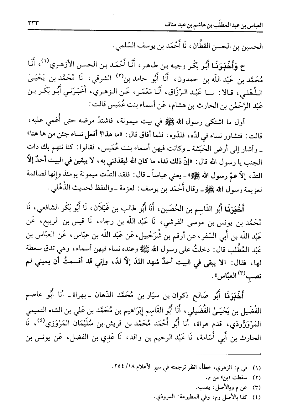الحسين بن الحسن القطان نا أحمد بن يوسف السلمي ح وأخبرنا أبو بكر وجيه بن طاهر أنا أحمد بن الحسن الأزهري (1) أنا محمد بن عبد الله بن حمدون أنا أبو حامد بن (2) الشرقي نا محمد بن يحيى الذهلي قالا نا عبد الرزاق أنا معمر عن الزهري أخبرني أبو بكر بن عبد الرحمن بن الحارث بن هشام عن أسماء بنت عميس قالت أول ما اشتكى رسول الله (صلى الله عليه وسلم) في بيت ميمونة فاشتد مرضه حتى أغمي عليه قالت فتشاور نساء في لده فلدوه فلما أفاق قال ما هذا أفعل نساء جئن من ها هنا وأشار إلى أرض الحبشة وكانت فيهن أسماء بنت عميس فقالوا كنا نتهم بك ذات الجنب يا رسول الله قال إن ذلك لداء ما كان الله ليقذفني به لا يبقين في البيت أحد إلا التد إلا عم رسول الله (صلى الله عليه وسلم) يعني عباسا قال فلقد التدت ميمونة يومئذ وإنها لصائمة لعزيمة رسول الله (صلى الله عليه وسلم) وقال أحمد بن يوسف لعزمة واللفظ لحديث الذهلي أخبرنا أبو القاسم بن الحصين أنا أبو طالب بن غيلان نا أبو بكر الشافعي نا محمد بن يونس بن موسى القرشي نا عبد الله بن رجاء نا قيس بن الربيع عن عبد الله بن أبي السفر عن أرقم بن شرحبيل عن عبد الله بن عباس عن العباس بن عبد المطلب قال دخلت على رسول الله (صلى الله عليه وسلم) وعنده نساء فيهن أسماء وهي تدق سعطة لها فقال لا يبقى في البيت أحد شهد اللد إلا لد وإني قد أقسمت أن يميني لم تصب (3) العباس أخبرنا أبو صالح ذكوان بن سياربن محمد الدهان بهراة أنا أبو عاصم الفضيل بن يحيى الفضيلي أنا أبو القاسم إبراهيم بن محمد بن علي بن الشاه التميمي المروروذي قدم هراة أنا أبو أحمد محمد بن قريش بن سليمان المروزي (4) نا الحارث بن أبي أسامة نا عبد الرحيم بن واقد ناعدي بن الفضل عن يونس بن