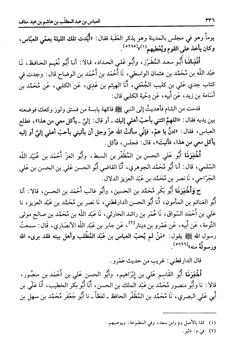[5665] أنبأنا أبو سعد المطرز وأبو علي الحداد قالا أنا أبو نعيم الحافظ نا عبد الله بن محمد بن عثمان الواسطي نا أحمد بن أحمد بن الوضاح قال وجدت في كتاب جدي علي بن كليب الجعفي أنا الهيثم بن عدي عن الكلبي عن محمد بن أسامة بن زيد عن أبيه عن دحية الكلبي قال قدمت من الشام فأهديت إلى النبي (صلى الله عليه وسلم) فاكهة يابسة من فستق ولوز وكعك فوضعته بين يديه فقال اللهم ائتني بأحب أهلي إليك أو قال إلي يأكل معي من هذا فطلع العباس فقال ادن يا عم فإني سألت الله عز وجل أن يأتيني بأحب أهلي إلي أو إليه يأكل معي من هذا فأتيت قال فجلس فأكل أخبرنا أبو علي الحسن بن المظفر بن البسط وأبو العز أحمد بن عبيد الله السلمي قال أنا أبو محمد الجوهري أنا القاضي أبو الحسن علي بن الحسن بن علي الجراحي نا نضر بن محمد بن عبد العزيز الدلال ح وأخبرنا أبو بكر محمد بن الحسين وأبو غالب أحمد بن الحسن قالا أنا أبو الغنائم بن المأمون أنا أبو الحسن الدارقطني نا نصر بن محمد بن عبد العزيز نا علي بن أحمد السواق نا عمر بن راشد الحارثي نا عبد الله بن محمد بن صالح مولى التومة عن أبيه عن عمرو بن دينار (2) عن جابر بن عبد الله الأنصاري قال سمعت رسول الله (صلى الله عليه وسلم) يقول من لم يحب العباس بن عبد المطلب وأهل بيته فقد برئ الله ورسوله منه