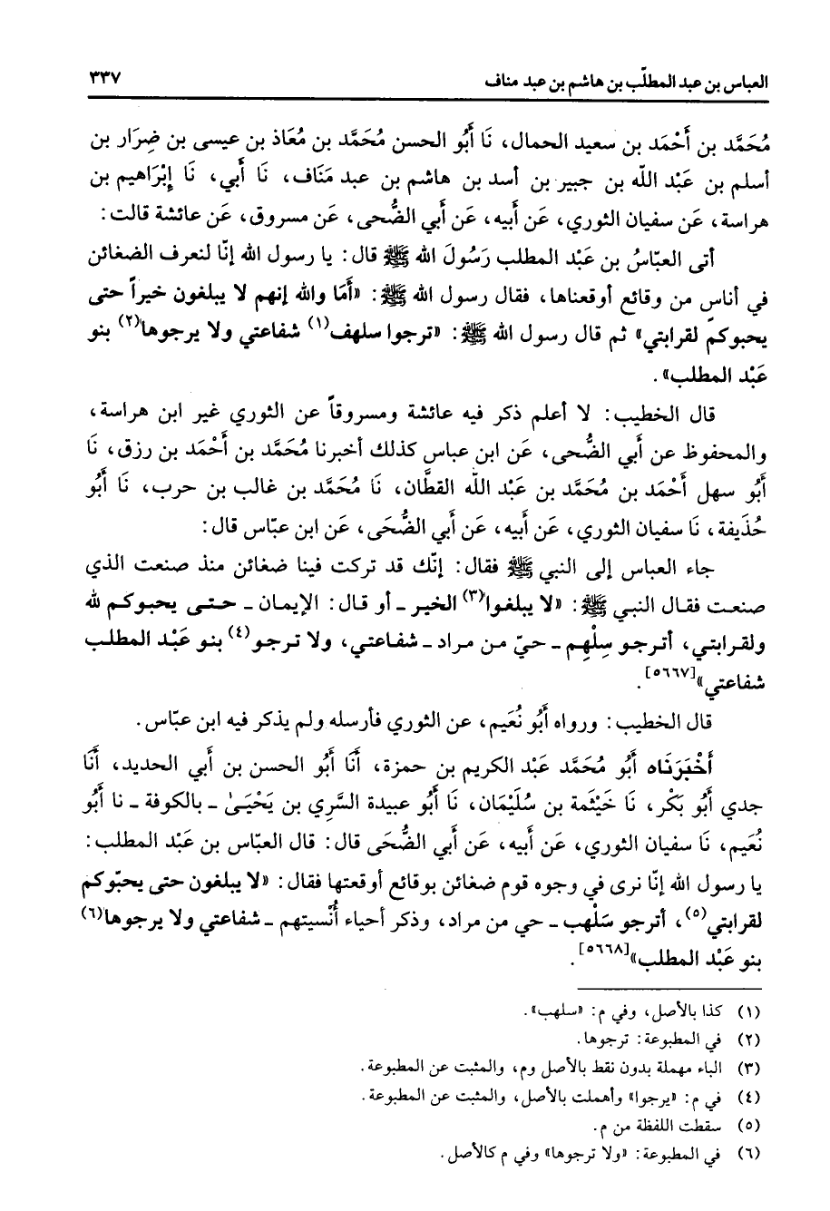محمد بن أحمد بن سعيد الحمال نا أبو الحسن محمد بن معاذ بن عيسى بن ضرار بن أسلم بن عبد الله بن جبير بن أسد بن هاشم بن عبد مناف نا أبي نا إبراهيم بن هراسة عن سفيان الثوري عن أبيه عن أبي الضحى عن مسروق عن عائشة قالت أتى العباس بن عبد المطلب رسول الله (صلى الله عليه وسلم) قال يا رسول الله إنا لنعرف الضغائن في أناس من وقائع أوقعناها فقال رسول الله (صلى الله عليه وسلم) أما والله إنهم لا يبلغون خيرا حتى يحبوكم لقرابتي ثم قال رسول الله (صلى اللهعليه وسلم) ترجوا سلهف (1) شفاعتي ولا يرجوها (2) بنو عبد المطلب قال الخطيب لا أعلم ذكر فيه عائشة ومسروقا عن الثوري غير ابن هراسة والمحفوظ عن أبي الضحى عن ابن عباس كذلك أخبرنا محمد بن أحمد بن رزق نا أبو سهل أحمد بن محمد بن عبد الله القطان نا محمد بن غالب بن حرب نا أبو حذيفة نا سفيان الثوري عن أبيه عن أبي الضحى عن ابن عباس قال جاء العباس إلى النبي (صلى الله عليه وسلم) فقال إنك قد تركت فينا ضغائن منذ صنعت الذي صنعت فقال النبي (صلى الله عليه وسلم) لا يبلغوا (3) الخير أو قال الإيمان حتى يحبوكم لله ولقرابتي أترجوا سلهم حي من مراد شفاعتي ولا ترجو (4) بنو عبد المطلب شفاعتي