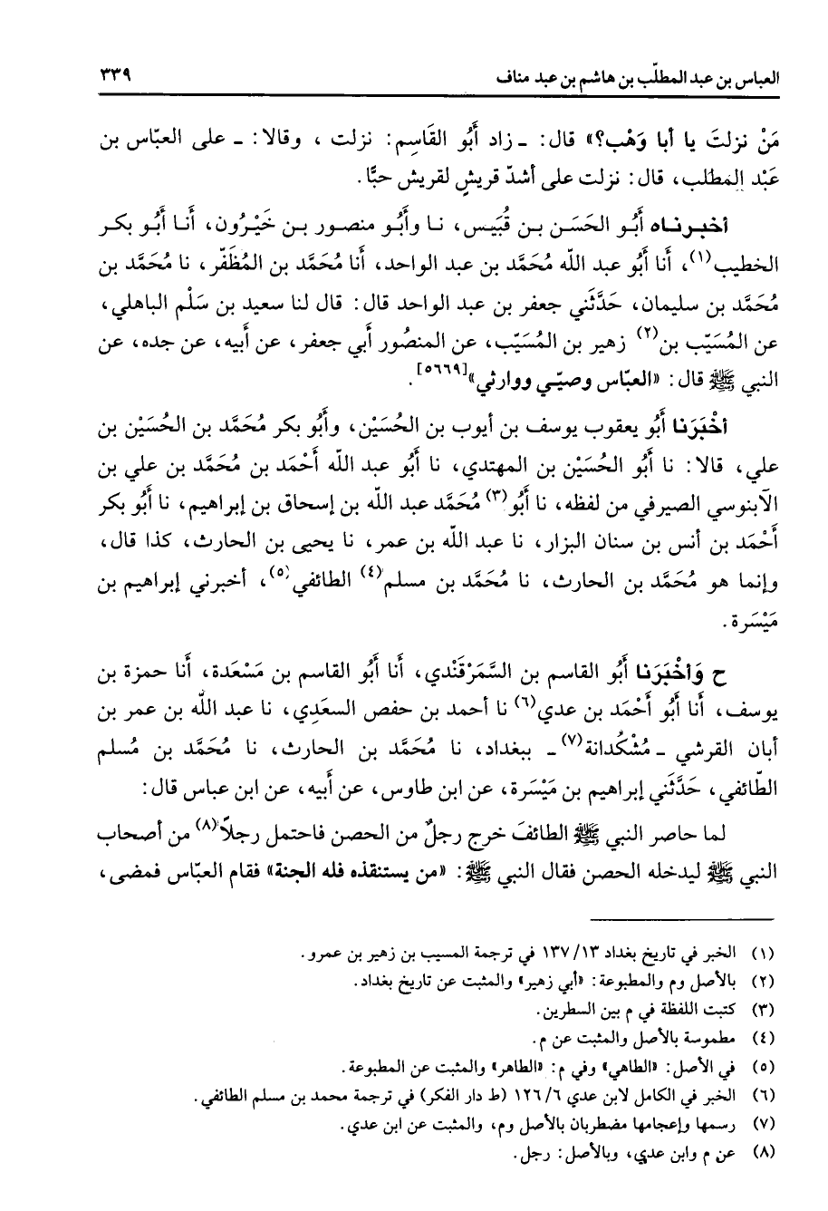 [5669] أخبرنا أبو يعقوب يوسف بن أيوب بن الحسين وأبو بكر محمد بن الحسين بن علي قالا نا أبو الحسين بن المهتدي نا أبو عبد الله أحمد بن محمد بن علي بن الآبنوسي الصيرفي من لفظه نا أبو (3) محمد عبد الله بن إسحاق بن إبراهيم نا أبو بكر أحمد بن أنس بن سنان البزار نا عبد الله بن عمرنا يحيى بن الحارث كذا قال وإنما هو محمد بن الحارث نا محمد بن مسلم (4) الطائفي (5) أخبرني إبراهيم بن ميسرة ح وأخبرنا أبو القاسم بن السمرقندي أنا أبو القاسم بن مسعدة أنا حمزة بن يوسف أنا أبو أحمد بن عدي (6) نا أحمد بن حفص السعدي نا عبد الله بن عمر بن أبان القرشي مشكدانة (7) ببغداد نا محمد بن الحارث نا محمد بن مسلم الطائفي حدثني إبراهيم بن ميسرة عن ابن طاوس عن أبيه عن ابن عباس قال لما حاصر النبي (صلى الله عليه وسلم) الطائف خرج رجل من الحصن فاحتمل رجلا (8) من أصحاب النبي (صلى الله عليه وسلم) ليدخله الحصن فقال النبي (صلى الله عليه وسلم) من يستنقذه فله الجنة فقام العباس فمضى