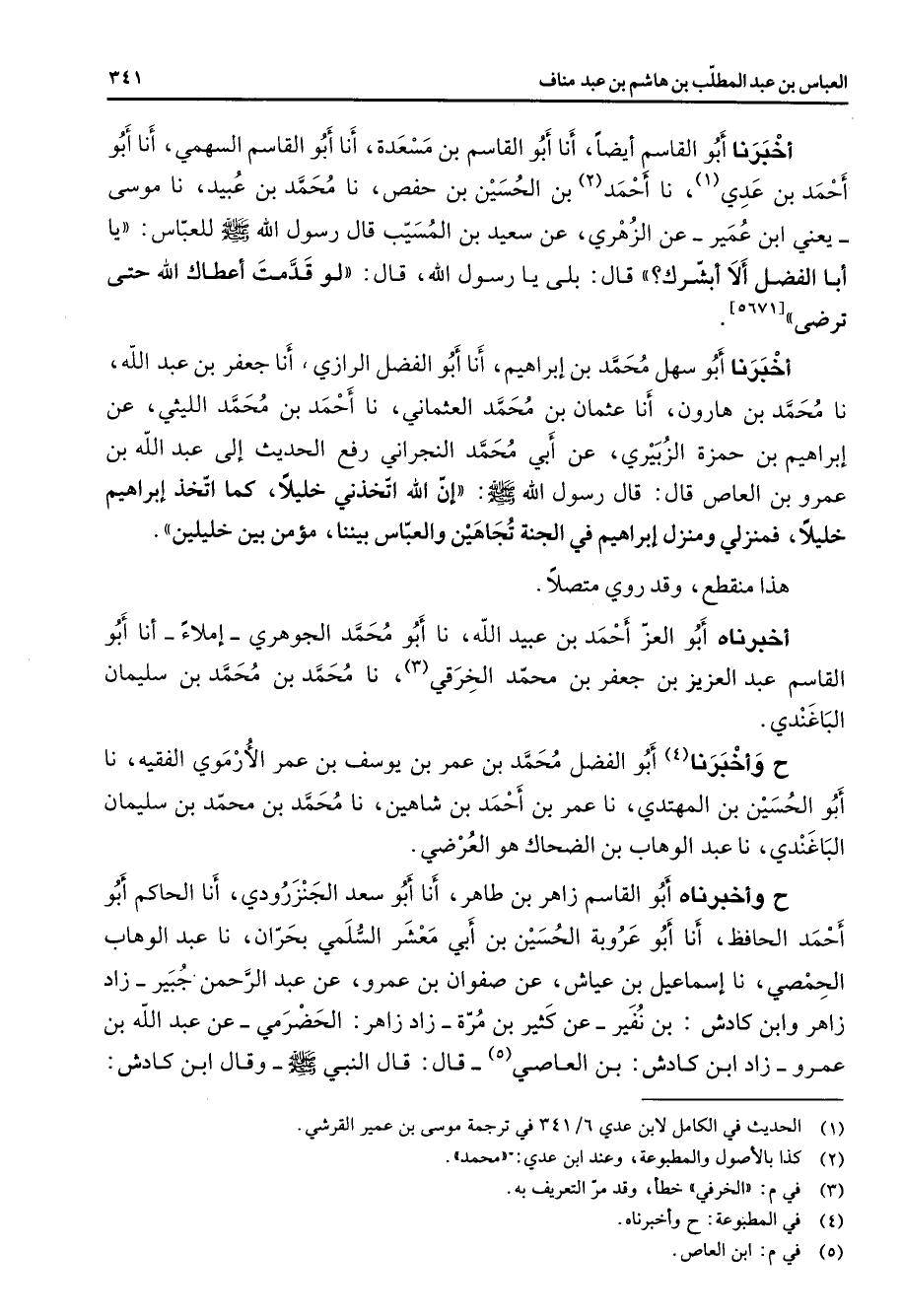 [5671] أخبرنا أبو سهل محمد بن إبراهيم أنا أبو الفضل الرازي أنا جعفر بن عبد الله نا محمد بن هارون أنا عثمان بن محمد العثماني نا أحمد بن محمد الليثي عن إبراهيم بن حمزة الزبيري عن أبي محمد النجراني رفع الحديث إلى عبد الله بن عمرو بن العاص قال قال رسول الله (صلى الله عليه وسلم) إن الله اتخذني خليلا كما اتخذ إبراهيم خليلا فمنزلي ومنزل إبراهيم في الجنة تجاهين والعباس بيننا مؤمن بين خليلين هذا منقطع وقد روي متصلا أخبرناه أبو العز أحمد بن عبيد الله نا أبو محمد الجوهري إملاء أنا أبو القاسم عبد العزيز بن جعفر بن محمد الخرقي (3) نا محمد بن محمد بن سليمان الباغندي ح وأخبرنا (4) أبو الفضل محمد بن عمر بن يوسف بن عمر الأرموي الفقيه نا أبو الحسين بن المهتدي نا عمر بن أحمد بن شاهين نا محمد بن محمد بن سليمان الباغندي نا عبد الوهاب بن الضحاك هو العرضي ح وأخبرناه أبو القاسم زاهر بن طاهر أنا أبو سعد الجنزرودي أنا الحاكم أبو أحمد الحافظ أنا أبو عروبة الحسين بن أبي معشر السلمي بحران نا عبد الوهاب الحمصي نا إسماعيل بن عياش عن صفوان بن عمرو عن عبد الرحمن جبير زاد زاهر وابن كادش بن نفير عن كثير بن مرة زاد زاهر الحضرمي عن عبد الله بن عمرو زاد ابن كادش بن العاصي (5) قال قال النبي (صلى الله عليه وسلم) وقال ابن كادش