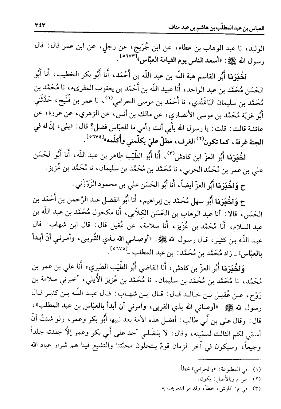 [5674] أخبرنا أبو العز ابن كادش (3) أنا أبو الطيب طاهر بن عبد الله أنا أبو الحسن علي بن عمر بن محمد الحربي نا محمد بن محمد بن سليمان نا محمد بن عزيز ح وأخبرنا أبو العز أيضا أنا أبو الحسن علي بن محمود الزوزني ح وأخبرنا أبو سهل محمد بن إبراهيم أنا أبو الفضل عبد الرحمن بن أحمد بن الحسن قالا أنا عبد الوهاب بن الحسن الكلابي أنا مكحول محمد بن عبد الله بن عبد السلام أنا محمد بن عزيز أنا سلامة عن عقيل قال قال ابن شهاب قال عبد الله بن كثير قال رسول الله (صلى الله عليه وسلم) أوصاني الله بذي القربى وأمرني أن أبدأ بالعباس زاد محمد بن محمد بن عبد المطلب