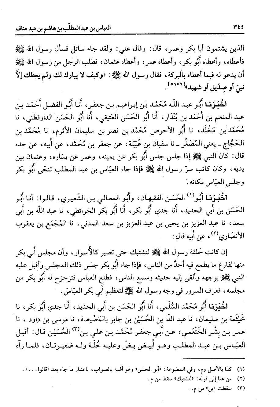 [5676] أخبرنا أبو عبد الله محمد بن إبراهيم بن جعفر أنا أبو الفضل أحمد بن عبد المنعم بن أحمد بن بندار أنا أبو الحسن العتيقي أنا أبو الحسن الدارقطني نا محمد بن مخلد نا أبو الأحوص محمد بن نصر بن سليمان الأثرم نا محمد بن الحجاج يعني المصغر نا سفيان بن عيينة عن جعفر بن محمد عن أبيه عن جده قال كان النبي (صلى الله عليه وسلم) إذا جلس جلس أبو بكر عن يمينه وعمر عن يساره وعثمان بين يديه وكان كاتب سر رسول الله (صلى الله عليه وسلم) فإذا جاء العباس بن عبد المطلب تنحى أبو بكر وجلس العباس مكانه أخبرنا أبو (1) الحسن الفقيهان وأبو المعالي بن الشعيري قالوا أنا أبو الحسن بن أبي الحديد أنا جدي أبو بكر أنا أبو بكر الخرائطي نا عبد الله بن أبي سعد نا عبد العزيز بن يحيى بن عبد العزيز بن سعد المدني نا المجمع بن يعقوب الأنصاري (2) عن أبيه قال إن كانت حلقة رسول الله (صلى الله عليه وسلم) لتشتبك حتى تصير كالأسوار وأن مجلس أبي بكر منها لفارغ ما يطمع فيه أحد من الناس فإذا جاء أبو بكر جلس ذلك المجلس وأقبل عليه النبي (صلى الله عليوسلم) بوجهه وألقى إليه حديثه وسمع الناس فطلع العباس فتزحزح له أبو بكر من مجلسه فعرف السرور في وجه رسول الله (صلى الله عليه وسلم) لتعظيم أبي بكر العباس أخبرنا أبو محمد السلمي أنا أبو الحسن بن أبي الحديد أنا جدي أبو بكر نا خيثمة بن سليمان نا عبد الله بن الحسين بن جابر بالمصيصة نا موسى بن داود نا عمر بن بشر الخثعمي عن أبي جعفر محمد بن علي بن (3) الحسين قال أقبل العباس بن عبد المطلب وهو أبيض بض وعليه حلة وله ضفيرتان فلما رآه