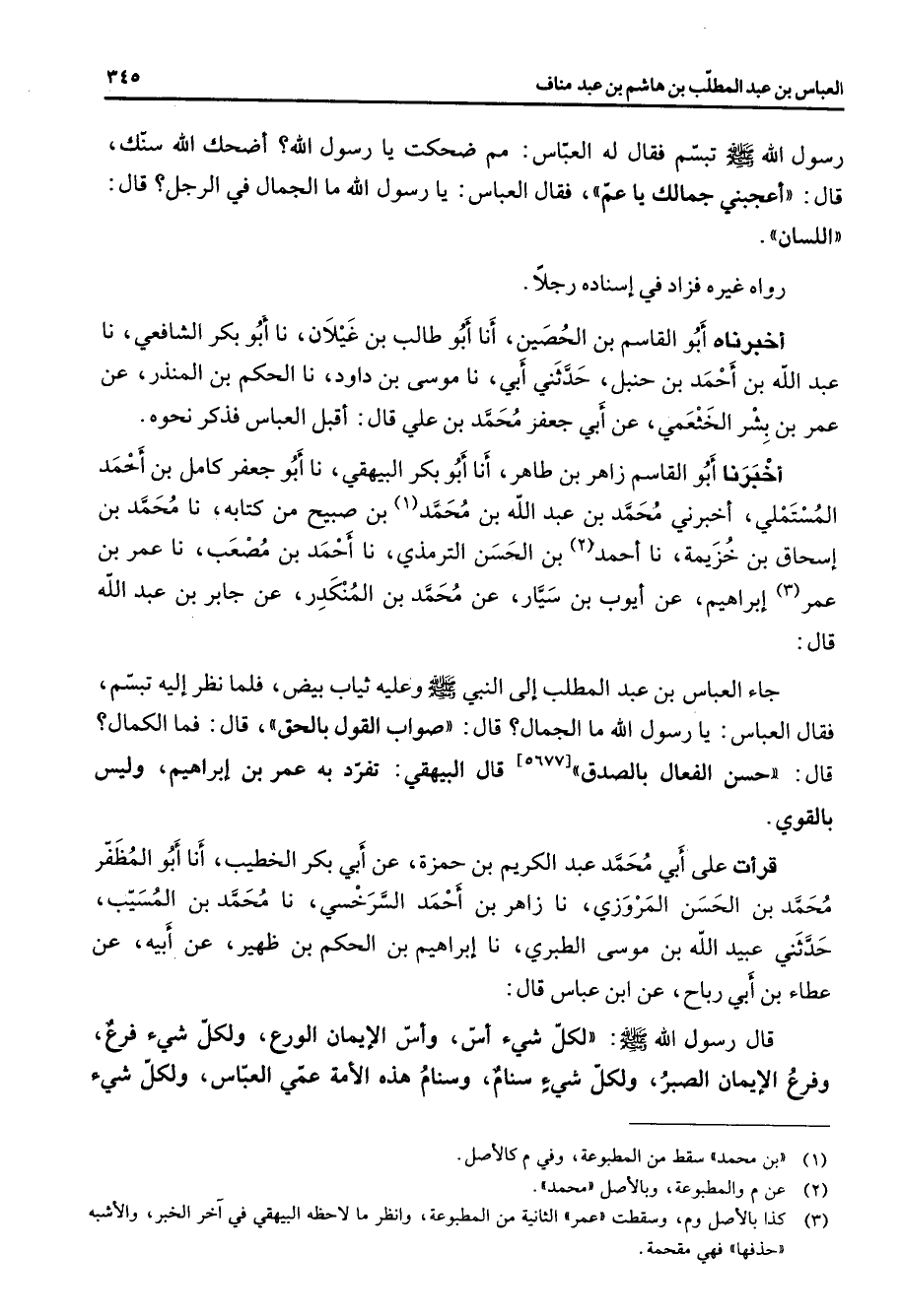 رسول الله (صلى الله عليه وسلم) تبسم فقال له العباس مم ضحكت يا رسول الله أضحك الله سنك قال أعجبني جمالك يا عم فقال العباس يا رسول الله ما الجمال في الرجل قال اللسان رواه غيره فزاد في إسناده رجلا أخبرناه أبو القاسم بن الحصين أنا أبو طالب بن غيلان نا أبو بكر الشافعي نا عبد الله بن أحمد بن حنبل حدثني أبي ناموسى بن داود نا الحكم بن المنذر عن عمر بن بشر الخثعمي عن أبي جعفر محمد بن علقال أقبل العباس فذكر نحوه أخبرنا أبو القاسم زاهر بن طاهر أنا أبو بكر البيهقي نا أبو جعفر كامل بن أحمد المستملي أخبرني محمد بن عبد الله بن محمد (2) بن صبيح من كتابه نا محمد بن إسحاق بن خزيمة نا أحمد (2) بن الحسن الترمذي نا أحمد بن مصعب نا عمر بن عمر (3) إبراهيم عن أيوب بن سيار عن محمد بن المنكدر عن جابر بن عبد الله قال جاء العباس بن عبد المطلب إلى النبي (صلى الله عليه وسلم) وعليه ثياب بيض فلما نظر إليه تبسم فقال العباس يا رسول الله ما الجمال قال صواب القول بالحق قال فما الكمال قال حسن الفعال بالصدق