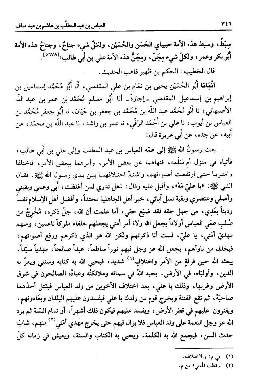 [5678] قال الخطيب الحكم بن ظهير ذاهب الحديث أنبأنا أبو الحسين يحيى بن تمام بن علي المقدسي أنا أبو محمد إسماعيل بن إبراهيم بن إسماعيل المقدسي إجازة أنا أبو مسلم محمد بن عمر بن عبد الله الأصبهاني نا أبو محمد عبد الله بن محمد بن جعفر بن حيان نا أبو جعفر محمد بن العباس بن أيوب نا علي بن أحمد الرقي نا عمر بن راشد نا عبد الله بن محمد عن أبيه عن جده عن أبي هريرة قال بعث رسول الله (صلى الله عليه وسلم) إلى عمه العباس بن عبد المطلب وإلى علي بن أبي طالب فأتياه في منزل أم سلمة فنهاهما عن بعض الأمر وأمرهما ببعض الأمر فاختلفا وامتريا حتى ارتفعت أصواتهما واشتد اختلافهما بين يدي رسول الله (صلى الله عليه وسلم) فقال النبي (صلى الله عليه وسلم) يا علي مه وأقبل عليه وقال هل تدري لمن أغلظت أبي وعمي وبقيتي وأصلي وعنصري وبقية نسل آبائي خير أهل الجاهلية محتدا وأفضل أهل الإسلام نفسا ودينا بعدي من جهل حقه فقد ضيع حقي أما علمت أن الله جل ذكره مخرج من صلب عمي العباس أولادا يجعل الله ولاة أمر أمتي يجعلهم خلفاء ملوكا ناعمين ومنهم مهدي أمتي يا علي لست أنا ذكرتهم ولكن الله هو الذي ذكرهم ورفع أصواتهم فيخذل من ناوأهم يجعل الله عز وجل فيهم نورا ساطعا عبدا صالحا مهديا سيدا يبعثه الله حين فرقة من الأمر واختلاف (1) شديد فيحيي الله به كتابه وسنتي ويعز به الدين وأولياءه في الأرض يحبه الله في سمائه وملائكته وعباده الصالحون في شرق الأرض وغربها وذلك يا علي بعد اختلاف الأخوين من ولد العباس فيقتل أحدهما صاحبه ثم تقع الفتنة ويخرج قوم من ولدك يا علي فيفسدون عليهم البلدان ويعادونهم ويفترون عليهم في قطر الأرض ويفسد عليهم فيكون ذلك أشهرا أو تمام السنة ثم يرد الله عزوجل النعمة على ولد العباس فلا يزال فيهم حتى يخرج مهدي أمتي (2) منهم شاب حدث السن فيجمع الله به الكلمة ويحيي به الكتاب والسنة ويعيش في زمانه كل