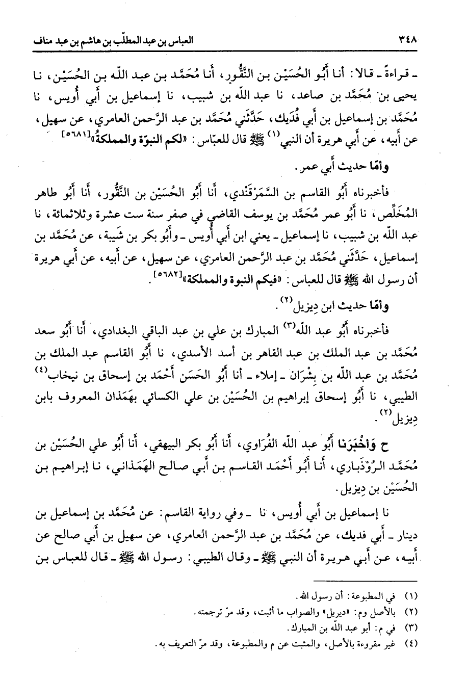 [5682] وأما حديث ابن ديزيل (2) فأخبرناه أبو عبد الله المبارك بن علي بن عبد الباقي البغدادي أنا أبو سعد محمد بن عبد الملك بن عبد القاهر بن أسد الأسدي نا أبو القاسم عبد الملك بن محمد بن عبد الله بن بشران إملاء أنا أبو الحسن أحمد بن إسحاق بن نيخاب (4) الطيبي نا أبو إسحاق إبراهيم بن الحسين بن علي الكسائي بهمذان المعروف بابن ديزيل (2) ح وأخبرنا أبو عبد الله الفراوي أنا أبو بكر البيهقي أنا أبو علي الحسين بن محمد الروذباري أنا أبو أحمد القاسم بن أبي صالح الهمذاني نا إبراهيم بن الحسين بن ديزيل نا إسماعيل بن أبي أويس نا وفي رواية القاسم عن محمد بن إسماعيل بن دينار أبي فديك عن محمد بن عبد الرحمن العامري عن سهيل بن أبي صالح عن أبيه عن أبي هريرة أن النبي (صلى الله عليه وسلم) وقال الطيبي رسول الله (صلى الله عليه وسلم) قال للعباس بن