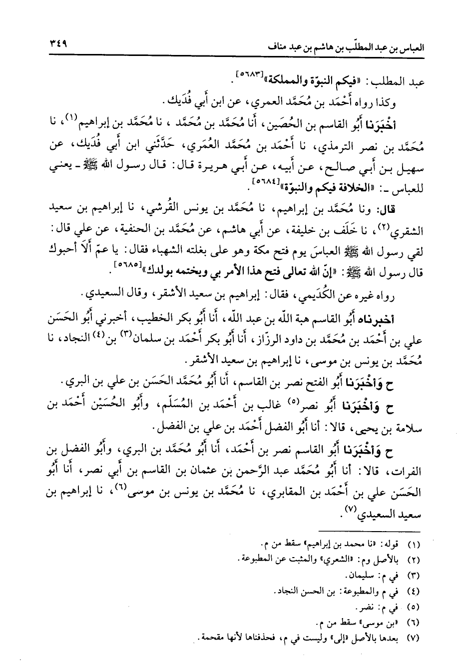 [5683] وكذا رواه أحمد بن محمد العمري عن ابن أبي فديك أخبرنا أبو القاسم بن الحصين أنا محمد بن محمد نا محمد بن إبراهيم (1) نا محمد بن نصر الترمذي نا أحمد بن محمد العمري حدثني ابن أبي فديك عن سهيل بن أبي صالح عن أبيه عن أبي هريرة قال قال رسول الله صلى الله عليه وسلم) يعني للعباس الخلافة فيكم والنبوة