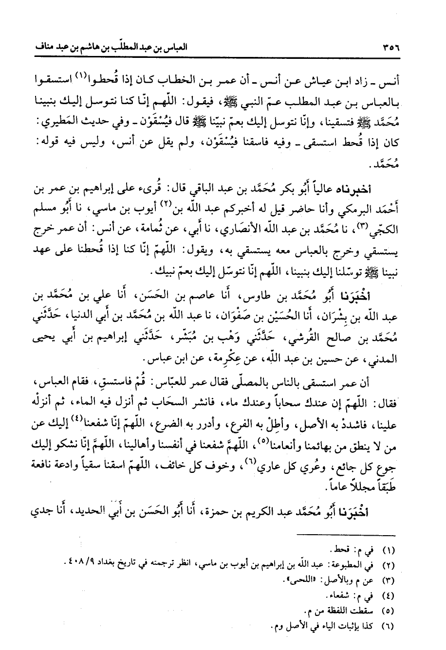 أنس زاد ابن عياش عن أنس أن عمر بن الخطاب كان إذا قحطوا (1) استسقوا بالعباس بن عبد المطلب عم النبي (صلى الله عليه وسلم) فيقول اللهم إنا كنا نتوسل إليك بنبينا محمد صلى الله عليه وسلم) فتسقينا وإنا نتوسل إليك بعم نبينا (صلى الله عليه وسلم) قال فيسقون وفي حديث المطيري كان إذا قحط استسقى وفيه فاسقنا فيسقون ولم يقل عن أنس وليس فيه قوله محمد أخبرناه عاليا أبو بكر محمد بن عبد الباقي قال قرئ على إبراهيم بن عمر بن أحمد البرمكي وأنا حاضر قيل له أخبركم عبد الله بن أيوب بن ماسي نا أبو مسلم الكجي (3) نا محمد بن عبد الله الأنصاري نا أبي عن ثمامة عن أنس أن عمر خرج يستسقي وخرج بالعباس معه يستسقي به ويقول اللهم إنا كنا إذاقحطنا على عهد نبينا (صلى الله عليه وسلم) توسلنا إليك بنبينا اللهم إنا نتوسل إليك بعم نبيك أخبرنا أبو محمد بن طاوس أنا عاصم بن الحسن أنا علي بن محمد بن عبد الله بن بشران أنا الحسين بن صفوان نا عبد الله بن محمد بن أبي الدنيا حدثني محمد بن صالح القرشي حدثني وهب بن مبشر حدثني إبراهيم بن أبي يحيى المدني عن حسين بن عبد الله عن عكرمة عن ابن عباس أن عمر استسقى بالناس بالمصلى فقال عمر للعباس قم فاستسق فقام العباس فقال اللهم إن عندك سحابا وعندك ماء فانشر السحاب ثم أنزل فيه الماء ثم أنزله علينا فاشدد به الأصل وأطل به الفرع وأدرر به الضرع اللهم إنا شفعنا (4) إليك عن من لا ينطق من بهائمنا وأنعامنا (5) اللهم شفعنا في أنفسنا وأهالينا اللهم إنا نشكو إليك جوع كل جائع وعري كل عاري (6) وخوف كل خائف اللهم اسقنا سقيا وادعة نافعة طبقا مجللا عاما أخبرنا أبو محمد عبد الكريم بن حمزة أنا أبو الحسن بن أبي الحديد أنا جدي