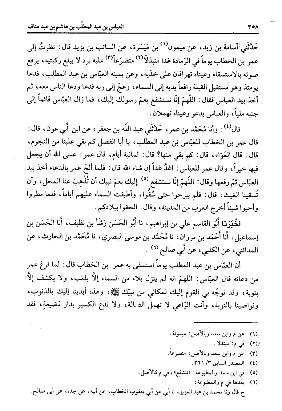 حدثني أسامة بن زيد عن ميمون (1) بن ميسرة عن السائب بن يزيد قال نظرت إلى عمر بن الخطاب يوما في الرمادة غدا متبذلا (2) متضرعا (3) عليه برد لا يبلغ ركبتيه يرفع عمر بن الخطاب يوما في الرمادة غدا متبذلا (2) متضرعا (3) عليه برد لا يبلغ ركبتيه يرفع صوته بالاستسقاء وعيناه تهراقان على خديه وعن يمينه العباس بن عبد المطلب فدعا يومئذ وهو مستقبل القبلة رافعا يديه إلى السماء وعج إلى ربه فدعا ودعا الناس معه ثم أخذ بيد العباس فقال اللهم إنا نستشفع بعم رسولك إليك فما زال العباس قائما إلى جنبه مليا والعباس يدعو وعيناه تهملان قال (4) وأنا محمد بن عمر حدثني عبد الله بن جعفر عن ابن أبي عون قال قال عمر بن الخطاب للعباس بن عبد المطلب يا أبا الفضل كم بقي علينا من النجوم قال قال العواء قال كم بقي منها قال ثمانية أيام قال عمر عسى الله أن يجعل فيها خيرا وقال عمر للعباس اغد غدا إن شاء الله قال فلما ألح عمر بالدعاء أخذ بيد العباس ثم رفعها وقال اللهم إنا نستشفع (5) إليك بعم نبيك أن تذهب عنا المحل وأن تسقينا الغيث قال فلم يبرحوا حتى سقوا وأطبقت السماء عليهم أياما فلما مطروا وأحيوا شيئا أخرج العرب من المدينة وقال الحقوا ببلادكم أخبرنا أبو القاسم علي بن إبراهيم نا أبو الحسن رشأ بن نظيف أنا الحسن بن إسماعيل أنا أحمد بن مروان نا محمد بن موسى البصري نا محمد بن الحارث عن المدائني عن الكلبي عن أبي صالح (6) أن العباس بن عبد المطلب يوما استسقى به عمربن الخطاب قال لما فرغ عمر من دعائه قال العباس اللهم انه لم ينزل بلاء من السماء إلا بذنب ولا يكشف إلا بتوبة وقد توجه بي القوم إليك لمكاني من نبيك (صلى الله عليه وسلم) وهذه أيدينا إليك بالذنوب ونواصينا بالتوبة وأنت الراعي لا تهمل الضالة ولا تدع الكسير بدار مضيعة فقد