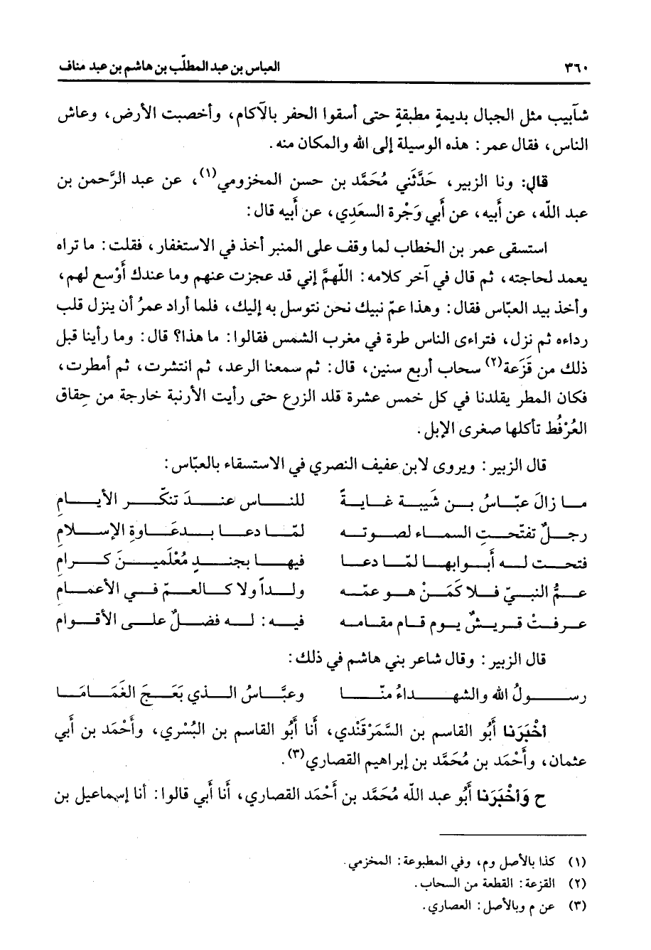 شآبيب مثل الجبال بديمة مطبقة حتى أسقوا الحفر بالآكام وأخصبت الأرض وعاش الناس فقال عمر هذه الوسيلة إلى الله والمكان منه قال ونا الزبير حدثني محمد بن حسن المخزومي (1) عن عبد الرحمن بن عبد الله عن أبيه عن أبي وجرة السعدي عن أبيه قال استسقى عمر بن الخطاب لما وقف على المنبر أخذ في الاستغفار فقلت ما تراه يعمد لحاجته ثم قال في آخر كلامه اللهم إني قد عجزت عنهم وما عندك أوسع لهم وأخذ بيد العباس فقال وهذا عم نبيك نحن نتوسل به إليك فلما أراد عمر أن ينزل قلب رداءه ثم نزل فتراءى الناس طرة في مغرب الشمس فقالوا ما هذا قال وما رأينا قبل ذلك من قزعة (2) سحاب أربع سنين قال ثم سمعنا الرعد ثم انتشرت ثم أمطرت فكان المطر يقلدنا في كل خمس عشرة قلد الزرع حتى رأيت الأرنبة خارجة من حقاق العرفط تأكلها صغرى الإبل قال الزبير ويروى لابن عفيف النصري في الاستسقاء بالعباس * ما زال عباس بن شيبة غاية * للناس عند تنكر الأيام رجل تفتحت السماء لصوته * لما دعا بدعاوة الإسلام فتحت له أبوابها لما دعا * فيها بجند معلمين كرام * * عم النبي فلا كمن هو عمه * ولدا ولا كالعم في الأعمام عرفت قريش يوم قام مقامه * فيه له فضل على الأقوام * قال الزبير وقال شاعر بني هاشم في ذلك * رسول الله والشهداء منا * وعباس الذي بعج الغماما * أخبرنا أبو القاسم بن السمرقندي أنا أبو القاسم بن البسري وأحمد بن أبي عثمان وأحمد بن محمد بن إبراهيم القصاري (3) ح وأخبرنا أبو عبد الله محمد بن أحمد القصاري أنا أبي قالوا أنا إسماعيل بن