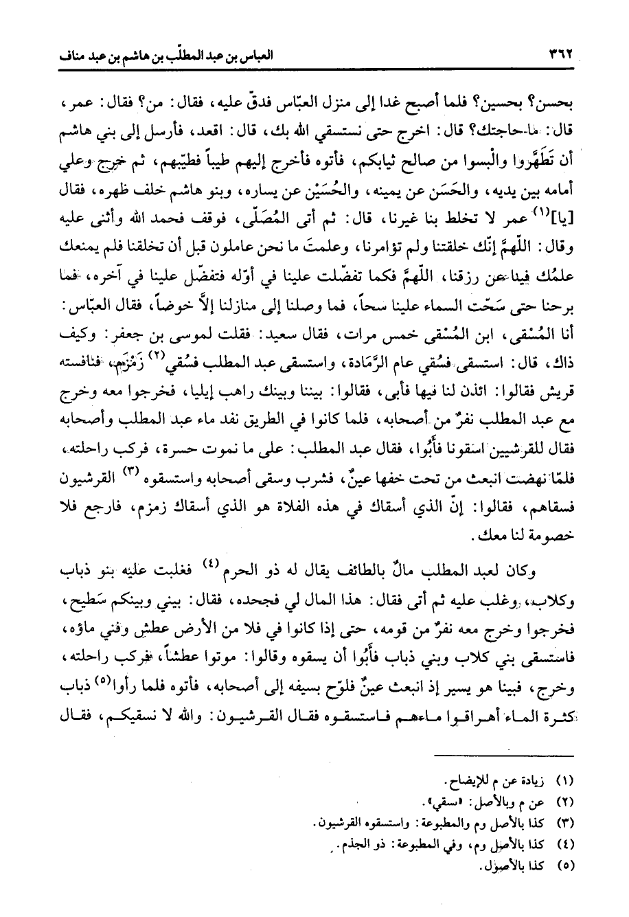 بحسن بحسين فلما أصبح غدا إلى منزل العباس فدق عليه فقال من فقال عمر قال ما حاجتك قال اخرج حتى نستسقي الله بك قال اقعد فأرسل إلى بني هاشم أن تطهروا والبسوا من صالح ثيابكم فأتوه فأخرج إليهم طيبا فطيبهم ثم خرج وعلي أمامه بين يديه والحسن عن يمينه والحسين عن يساره وبنو هاشم خلف ظهره فقال يا (1) عمر لا تخلط بنا غيرنا قال ثم أتى المصلى فوقف فحمد الله وأثنى عليه وقال اللهم إنك خلقتنا ولم تؤامرنا وعلمت ما نحن عاملون قبل أن تخلقنا فلم يمنعك علمك فينا عن رزقنا اللهم فكما تفضلت علينا في أوله فتفضل علينا في آخره فما برحنا حتى سحت السماء علينا سحا فما وصلنا إلى منازلنا إلا خوضا فقال العباس أنا المسقى ابن المسقى خمس مرات فقال سعيد فقلت لموسى بن جعفر وكيف ذاك قال استسقي فسقي عام الرمادة واستسقى عبد المطلب فسقي (2) زمزم فنافسته قريش فقالوا ائذن لنا فيها فأبى فقالوا بيننا وبينك راهب إيليا فخرجوا معه وخرج مع عبد المطلب نفر من أصحابه فلما كانوا في الطريق نفد ماء عبد المطلب وأصحابه فقال للقرشيين اسقونا فأبوا فقال عبد المطلب على ما نموت حسرة فركب راحلته فلما نهضت انبعث من تحت خفها عين فشرب وسقى أصحابه واستسقوه (3) القرشيون فسقاهم فقالوا إن الذي أسقاك في هذه الفلاة هو الذي أسقاك زمزم فارجع فلا خصومة لنا معك وكان لعبد المطلب ما بالطائف يقال له ذو الحرم (4) فغلبت عليه بنو ذباب وكلاب وغلب عليه ثم أتى فقال هذا المال لي فجحده فقال بيني وبينكم سطيح فخرجوا وخرج معه نفر من قومه حتى إذا كانوا في فلا من الأرض عطش وفني ماؤه فاستسقى بني كلاب وبني ذباب فأبوا أن يسقوه وقالوا موتوا عطشا فركب راحلته وخرج فبينا هو يسير إذ انبعث عين فلوح بسيفه إلى أصحابه فأتوه فلما رأوا (5) ذباب كثرة الماء أهراقوا ماءهم فاستسقوه فقال القرشيون والله لا نسقيكم فقال
