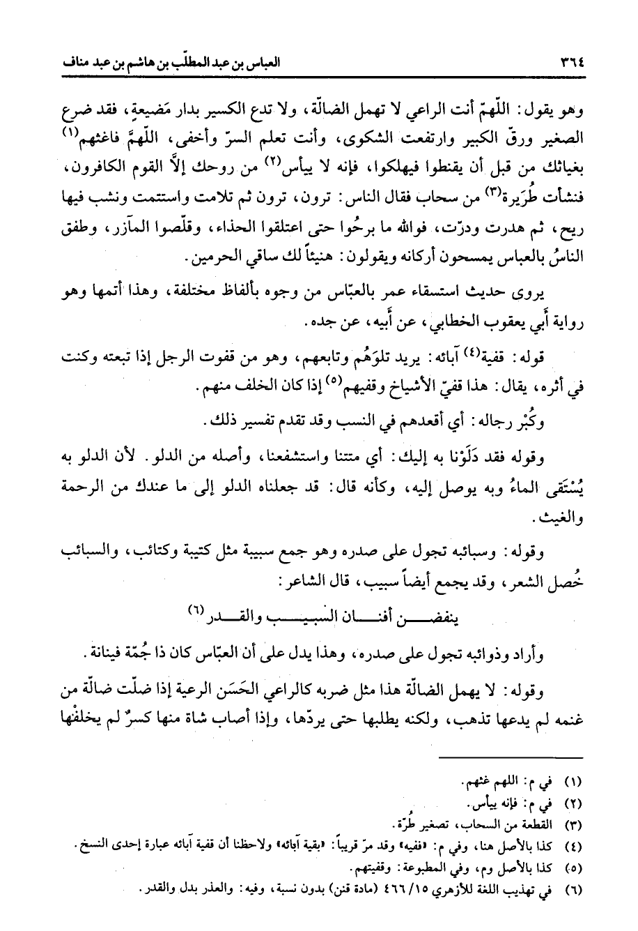 وهو يقول اللهم أنت الراعي لا تهمل الضالة ولا تدع الكسير بدار مضيعة فقد ضرع الصغير ورق الكبير وارتفعت الشكوى وأنت تعلم السر وأخفى اللهم فاغثهم (1) بغياثك من قبل أن يقنطوا فيهلكوا فإنه لا ييأس (2) من روحك إلا القوم الكافرون فنشأت طريرة (3) من سحاب فقال الناس ترون ترون ثم تلامت واستتمت ونشب فيها ريح ثم هدرت ودرت فوالله ما برحوا حتى اعتلقوا الحذاء وقلصوا المآزر وطف الناس بالعباس يمسحون أركانه ويقولون هنيئا لك ساقي الحرمين يروى حديث استسقاء عمر بالعباس من وجوه بألفاظ مختلفة هذا أتمها وهو رواية أبي يعقوب الخطابي عن أبيه عن جده قوله قفية (4) آبائه يريد تلوهم وتابعهم وهو من قفوت الرجل إذا تبعته وكنت في أثره يقال هذا قفي الأشياخ وقفيهم (5) إذا كان الخلف منهم وكبر رجاله أي أقعدهم في النسب وقد تقدم تفسير ذلك وقوله فقد دلونا به إليك أي متتنا واستشفعنا وأصله من الدلو لأن الدلو به يستقى الماء وبه يوصل إليه وكأنه قال قد جعلناه الدلو إلى ما عندك من الرحمة والغيث وقوله وسبائبه تجول على صدره وهو جمع سبيبة مثل كتيبة وكتائب والسبائب خصل الشعر وقد يجمع أيضا سبيب قال الشاعر * ينفضن أفنان السبيب والقدر (6) * وأراد وذوائبه تجول على صدره وهذا يدل على أن العباس كان ذا جمة فينانة وقوله لا يهمل الضالة هذا مثل ضربه كالراعي الحسن الرعية إذا ضلت ضالة من غنمه لم يدعها تذهب ولكنه يطلبها حتى يردها وإذا أصاب شاة منها كسر لم يخلفها