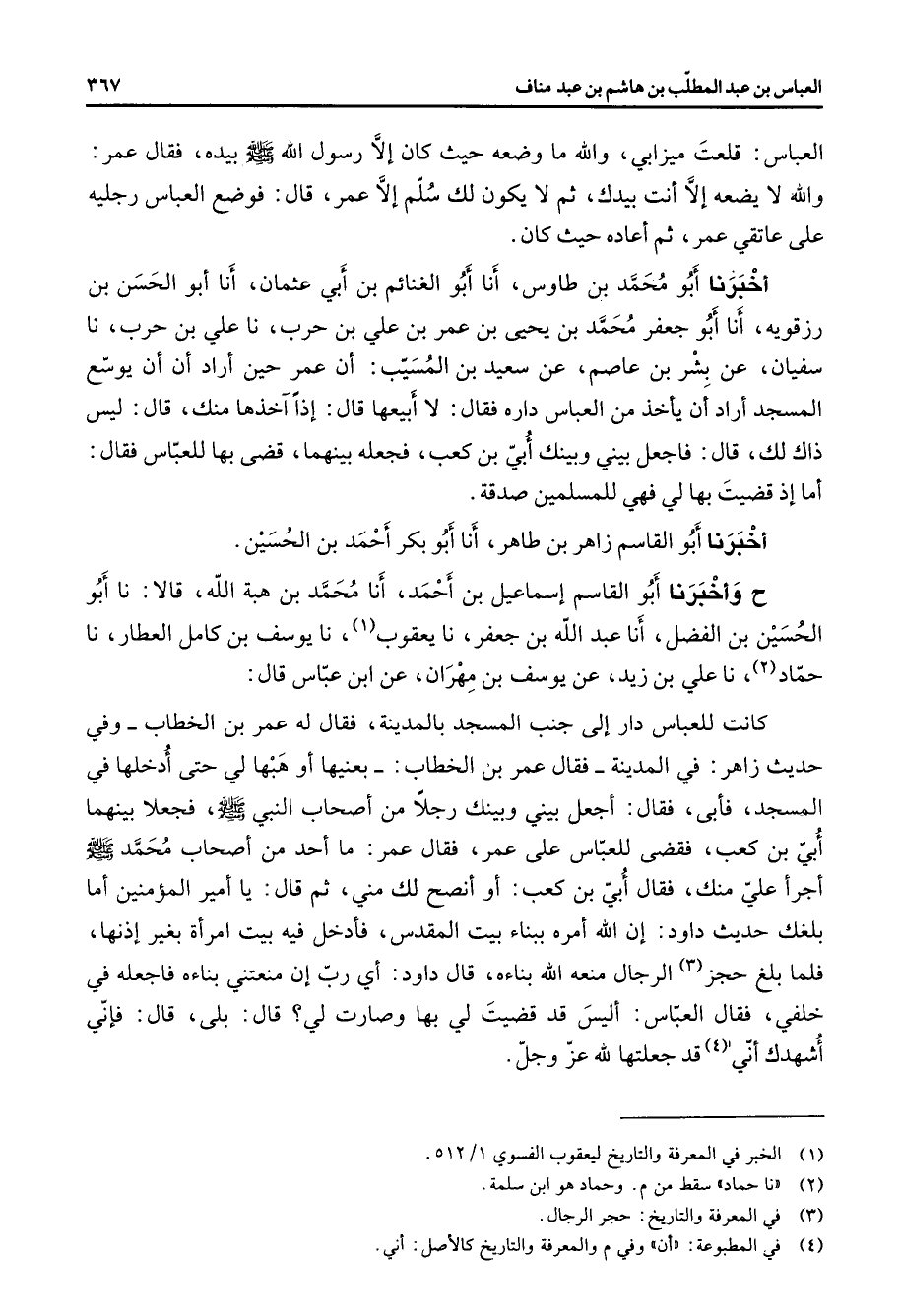 العباس قلعت ميزابي والله ما وضعه حيث كان إلا رسول الله (صلى الله عليه وسلم) بيده فقال عمر والله لا يضعه إلا أنت بيدك ثم لا يكون لك سلم إلا عمر قال فوضع العباس رجليه على عاتقي عمر ثم أعاده حيث كان أخبرنا أبو محمد بن طاوس أنا أبو الغنائم بن أبي عثمان أنا أبو الحسن بن رزقويه أنا أبو جعفر محمد بن يحيى بن عمر بن علي بن حرب نا علي بن حرب نا سفيان عن بشر بن عاصم عن سعيد بن المسيب أن عمر حين أراد أن يوسع المسجد أراد أن يأخذ من العباس داره فقال لا أبيعها قال إذا آخذها منك قال ليس ذاك لك قال فاجعل بيني وبينك أبي بن كعب فجعله بينهما قضى بها للعباس فقال أما إذ قضيت بها لي فهي للمسلمين صدقة أخبرنا أبو القاسم زاهر بن طاهر أنا أبو بكر أحمد بن الحسين ح وأخبرنا أبو القاسم إسماعيل بن أحمد أنا محمد بن هبة الله قالا نا أبو الحسين بن الفضل أنا عبد الله بن جعفر نا يعقوب (1) نا يوسف بن كامل العطار نا حماد (2) نا علي بن زيد عن يوسف بن مهران عن ابن عباس قال كانت للعباس دار إلى جنب المسجد بالمدينة فقال له عمر بن الخطاب وفي حديث زاهر في المدينة فقال عمر بن الخطاب بعنيها أو هبها لي حتى أدخلها في المسجد فأبى فقال أجعل بيني وبينك رجلا من أصحاب النبي (صلى الله عليه وسلم) فجعلا بينهما أبي بن كعب فقضى للعباس على عمر فقال عمر ما أحد من أصحاب محمد (صلى الله عليه وسلم) أجرا علي منك فقال أبي بن كعب أو أنصح لك مني ثم قال يا أمير المؤمنين أما بلغك حديث داود إن الله أمره ببناء بيت المقدس فأدخل فيه بيت امرأة بغير إذنها فلما بلغ حجز (3) الرجال منعه الله بناءه قال داود أي رب إن منعتني بناءه فاجعله في خلفي فقال العباس أليس قد قضيت لي بها وصارت لي قال بلى قال فإني أشهدك أني (4) قد جعلتها لله عز وجل
