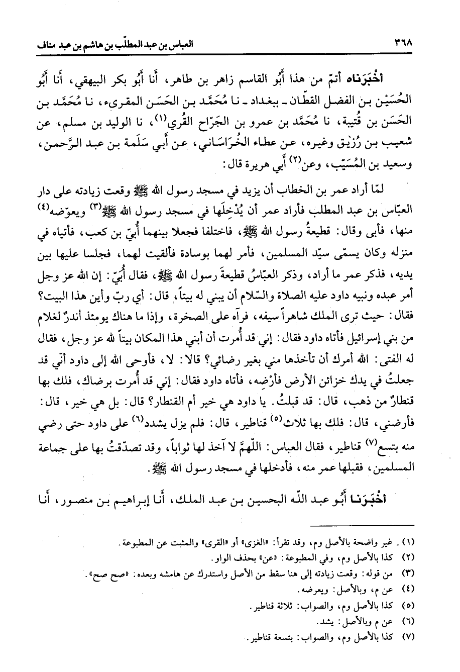 أخبرناه أتم من هذا أبو القاسم زاهر بن طاهر أنا أبو بكر البيهقي أنا أبو الحسين بن الفضل القطان ببغداد نا محمد بن الحسن المقرئ نا محمد بن الحسن بن قتيبة نا محمد بن عمرو بن الجراح القري (1) نا الوليد بن مسلم عن شعيب بن رزيق وغيره عن عطاء الخراساني عن أبي سلمة بن عبد الرحمن وسعيد بن المسيب وعن (2) أبي هريرة قال لما أراد عمر بن الخطاب أن يزيد في مسجد رسول الله (صلى الله عليه وسلم) وقعت زيادته على دار العباس بن عبد المطلب فأراد عمر أن يدخلها في مسجد رسول الله (صلى الله عليه وسلم) (3) ويعوضه (4) منها فأبى وقال قطيعة رسول الله (صلى الله عليه وسلم) فاختلفا فجعلا بينهما أبي بن كعب فأتياه في منزله وكان يسمى سيد المسلمين فأمر لهما بوسادة فألقيت لهما فجلسا عليها بين يديه فذكر عمر ما أراد وذكر العباس قطيعة رسول الله (صلى الله عليه وسلم) فقال أبي إن الله عز وجل أمر عبده ونبيه داود عليه الصلاة والسلام أن يبني له بيتا قال أي رب وأين هذا البيت فقال حيث ترى الملك شاهرا سيفه فرآه على الصخرة وإذا ما هناك يومئذ أندر لغلام من بني إسرائيل فأتاه داود فقال إني قد أمرت أن أبني هذا المكان بيتا لله عز وجل فقال له الفتى الله أمرك أن تأخذها مني بغير رضائي قالا لا فأوحى الله إلى داود أني قد جعلت في يدك خزائن الأرض فأرضه فأتاه داود فقال إني قد أمرت برضاك فلك بها قنطار من ذهب قال قد قبلت يا داود هي خير أم القنطار قال بل هي خير قال فأرضني قال فلك بها ثلاث (5) قناطير قال فلم يزل يشدد (6) على داود حتى رضي منه بتسع (7) قناطير فقال العباس اللهم لا آخذ لها ثوابا وقد تصدقت بها على جماعة المسلمين فقبلها عمر منه فأدخلها في مسجد رسول الله (صلى الله عليه وسلم) أخبرنا أبو عبد الله بن عبد الملك أنا إبراهيم بن منصور أنا