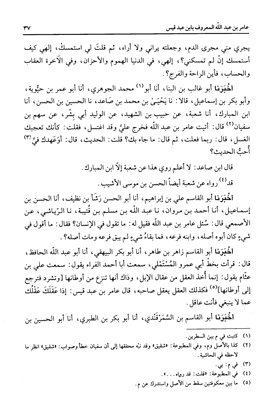 يجري مني مجرى الدم وجعلته يراني ولا أراه ثم قلت لي استمسك إلهي كيف أستمسك إن لم تمسكني إلهي في الدنيا الهموم والأحزان وفي الآخرة العقاب والحساب فأين الراحة والفرج أخبرنا أبو غالب بن البنا أنا أبو (1) محمد الجوهري أنا أبو عمر بن حيوية وأبو بكر بن إسماعيل قالا نا يحيى بن محمد بن صاعد نا الحسين بن الحسن أنا ابن المبارك أنا شعبة عن حبيب بن الشهيد عن الوليد أبي بشر عن سهم بن سفيان (2) قال أتيت عامر بن عبد الله فخرج علي وقد اغتسل فقلت كأنك تعجبك الغسل قال ربما فعلت ثم قال ما جاء بك قلت الحديث قال أوعهدك في (3) أحب الحديث قال ابن صاعد لا أعلم روي هذا عن شعبة إلا ابن المبارك قد (4) رواه عن شعبة أيضا الحسن بن موسى الأشيب أخبرنا أبو القاسم علي بن إبراهيم أنا أبو الحسن رشأ بن نظيف أنا الحسن بن إسماعيل أنا أحمد بن مروان نا عبد الله بن مسلم بن قتيبة نا الرياشي عن الأصمعي قال سئل عامر بن عبد الله فقيل له ما تقول في الإنسان فقال ما أقول في شئ كان أبوه أصله وابنه فرعه فما بقاء شئ لم يبق فرعه ومات أصله أخبرنا أبو القاسم زاهر بن طاهر أنا أبو بكر البيهقي أنا أبو عبد الله الحافظ قال قرأت بخط أبي عمرو المستملي سمعت أبا أحمد الفراء يقول سمعت علي بن عثام يقول إنما أخذ العقل من عقال الإبل وذاك أنها تنزع من أوطانها وتشرد فترجع إلى أوطانها (5) فكذلك العقل يعقل صاحبه قال عامر بن عبد قيس إذا عقلك عقلك عما لا ينبغي فأنت عاقل أخبرنا أبو القاسم بن السمرقندي أنا أبو بكر بن الطبري أنا أبو الحسين بن