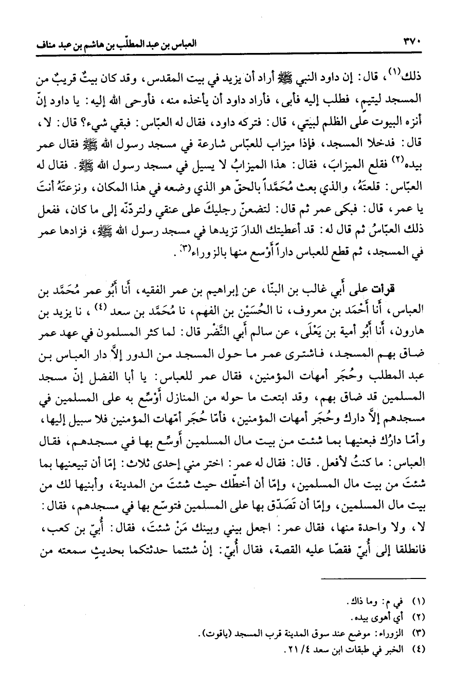 ذلك (1) قال إن داود النبي (صلى الله عليه وسلم) أراد أن يزيد في بيت المقدس وقد كان بيت قريب من المسجد ليتيم فطلب إليه فأبى فأراد داود أن يأخذه منه فأوحى الله إليه يا داود إن أنزه البيوت على الظلم لبيتي قال فتركه داود فقال له العباس فبقي شئ قال لا قال فدخلا المسجد فإذا ميزاب للعباس شارعة في مسجد رسول الله (صلى الله عليه وسلم) فقال عمر بيده (2) فقلع الميزاب فقال هذا الميزاب لا يسيل في مسجد رسول الله (صلى الله عليه وسلم) فقال له العباس قلعته والذي بعث محمدا بالحق هو الذي وضعه في هذا المكان ونزعته أنت يا عمر قال فبكى عمر ثم قال لتضعن رجليك على عنقي ولتردنه إلى ما كان ففعل ذلك العباس ثم قال له قد أعطيتك الدار تزيدها في مسجد رسول الله (صلى الله عليه وسلم) فزادها عمر في المسجد ثم قطع للعباس دارا أوسع منها بالزوراء (3) قرأت على أبي غالب بن البنا عن إبراهيم بن عمر الفقيه أنا أبو عمر محمد بن العباس أنا أحمد بن معروف نا الحسين بن الفهم نا محمد بن سعد (4) نا يزيد بن هارون أنا أبو أمية بن يعلى عن سالم أبي النضر قال لما كثر المسلمون في عهد عمر ضاق بهم المسجد فاشترى عمر ما حول المسجد من الدور إلا دار العباس بن عبد المطلب وحجر أمهات المؤمنين فقال عمر للعباس يا أبا الفضل إن مسجد المسلمين قد ضاق بهم وقد ابتعت ما حوله من المنازل أوسع به على المسلمين في مسجدهم إلا دارك وحجر أمهات المؤمنين فأما حجر أمهات المؤمنين فلا سبيل إليها وأما دارك فبعنيها بما شئت من بيت مال المسلمين أوسع بها في مسجدهم فقال العباس ما كنت لأفعل قال فقال له عمر اختر مني إحدى ثلاث إما أن تبيعنيها بما شئت من بيت مال المسلمين وإما أن أخطك حيث شئت من المدينة وأبنيها لك من بيت مال المسلمين وإما أن تصدق بها على المسلمين فتوسع بها في مسجدهم فقال لا ولا واحدة منها فقال عمر اجعل بيني وبينك من شئت فقال أبي بن كعب فانطلقا إلى أبي فقصا عليه القصة فقال أبي إن شئتما حدثتكما بحديث سمعته من