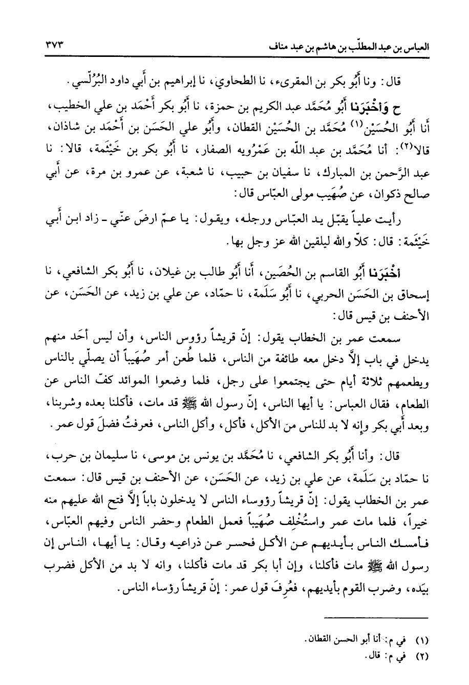 قال ونا أبو بكر بن المقرئ نا الطحاوي نا إبراهيم بن أبي داود البرلسي ح وأخبرنا أبو محمد عبد الكريم بن حمزة نا أبو بكر أحمد بن علي الخطيب أنا أبو الحسين (1) محمد بن الحسين القطان وأبو علي الحسن بن أحمد بن شاذان قالا (2) أنا محمد بن عبد الله بن عمرويه الصفار نا أبو بكر بن خيثمة قالا نا عبد الرحمن بن المبارك نا سفيان بن حبيب نا شعبة عن عمرو بن مرة عن أبي صالح ذكوان عن صهيب مولى العباس قال رأيت عليا يقبل العباس ورجله ويقول يا عم ارض عني زاد ابن أبي خيثمة قال كلا والله ليلقين الله عز وجل بها أخبرنا أبو القاسم بن الحصين أنا أبو طالب بن غيلان نا أبو بكر الشافعي نا إسحاق بن الحسن الحربي نا أبو سلمة نا حماد عن علي بن زيد عن الحسن عن الأحنف بن قيس قال سمعت عمر بن الخطاب يقول إن قريشا رؤوس الناس وأن ليس أحد منهم يدخل في باب إلا دخل معه طائفة من الناس فلما طعن أمر صهيبا أن يصلي بالناس ويطعمهم ثلاثة أيام حتى يجتمعوا على رجل فلما وضعوا الموائد كف الناس عن الطعام فقال العباس يا أيها الناس إن رسول الله (صلى الله عليه وسلم) قد مات فأكلنا بعده وشربنا وبعد أبي بكر وإنه لا بد للناس من الأكل فأكل وأكل الناس فعرفت فضل قول عمر قال وأنا أبو بكر الشافعي نا محمد بن يونس بن موسى نا سليمان بن حرب نا حماد بن سلمة عن علي بن زيد عن الحسن عن الأحنف بن قيس قال سمعت عمر بن الخطاب يقول إن قريشا رؤوساء الناس لا يدخلون بابا إلا فتح الله عليهم منه خيرا فلما مات عمر واستخلف صهيبا فعمل الطعام وحضر الناس وفيهم العباس فأمسك الناس بأيديهم عن الأكل فحسر عن ذراعيه وقال يا أيها الناس إن رسول الله (صلى الله عليه وسلم) مات فأكلنا وإن أبا بكر قد مات فأكلنا وإنه لا بد من الأكل فضرب بيده وضرب القوم بأيديهم فعرف قول عمر إن قريشا رؤساء الناس