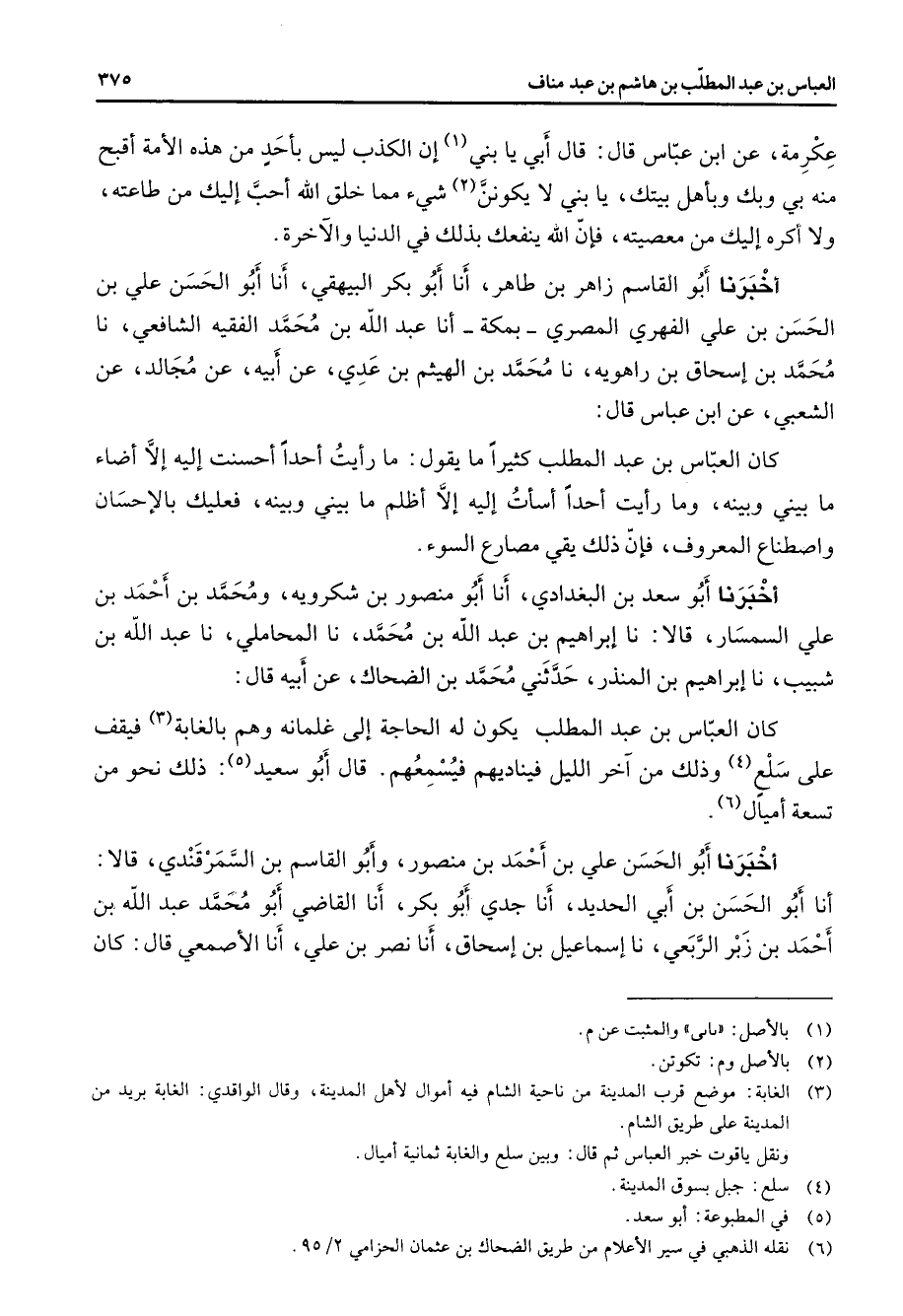 عكرمة عن ابن عباس قال قال أبي يا بني (1) إن الكذب ليس بأحد من هذه الأمة أقبح منه بي وبك وبأهل بيتك يا بني لا يكونن (2) شئ مما خلق الله أحب إليك من طاعته ولا أكره إليك من معصيته فإن الله ينفعك بذلك في الدنيا والآخرة أخبرنا أبو القاسم زاهر بن طاهر أنا أبو بكر البيهقي أنا أبو الحسن علي بن الحسن بن علي الفهري المصري بمكة أنا عبد الله بن محمد الفقيه الشافعي نا محمد بن إسحاق بن راهويه نا محمد بن الهيثم بن عدي عن أبيه عن مجالد عن الشعبي عن ابن عباس قال كان العباس بن عبد المطلب كثيرا ما يقول ما رأيت أحدا أحسنت إليه إلا أضاء ما بيني وبينه وما رأيت أحدا أسأت إليه إلا أظلم ما بيني وبينه فعليك بالإحسان واصطناع المعروف فإن ذلك يقي مصارع السوء أخبرنا أبو سعد بن البغدادي أنا أبو منصور بن شكرويه ومحمد بن أحمد بن علي السمسار قالا نا إبراهيم بن عبد الله بن محمد نا المحاملي نا عبد الله بن شبيب نا إبراهيم بن المنذر حدثني محمد بن الضحاك عن أبيه قال كان العباس بن عبد المطلب يكون له الحاجة إلى غلمانه وهم بالغابة (3) فيقف على سلع (4) وذلك من آخر الليل فيناديهم فيسمعهم قال أبو سعيد (5) ذلك نحو من تسعة أميال (6) أخبرنا أبو الحسن علي بن أحمد بن منصور وأبو القاسم بن السمرقندي قالا أنا أبو الحسن بن أبي الحديد أنا جدي أبو بكر أنا القاضي أبو محمد عبد الله بن أحمد بن زبر الربعي نا إسماعيل بن إسحاق أنا نصر بن علي أنا الأصمعي قال كان