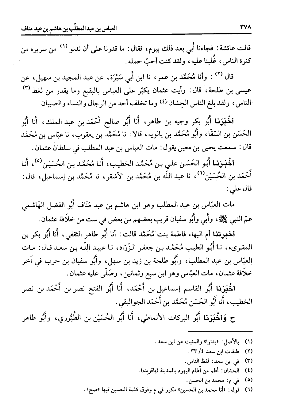 قالت عائشة فجاءنا أبي بعد ذلك بيوم فقال ما قدرنا على أن ندنو (1) من سريره من كثرة الناس غلبنا عليه ولقد كنت أحب حمله قال (2) وأنا محمد بن عمر نا ابن أبي سبرة عن عبد المجيد بن سهيل عن عيسى بن طلحة قال رأيت عثمان يكبر على العباس بالبقيع وما يقدر من لغط (3) الناس ولقد بلغ الناس الحشان (4) وما تخلف أحد من الرجال والنساء والصبيان أخبرنا أبو بكر وجيه بن طاهر أنا أبو صالح أحمد بن عبد الملك أنا أبو الحسن بن السقا وأبو محمد بن بالويه قالا نا محمد بن يعقوب نا عباس بن محمد قال سمعت يحيى بن معين يقول مات العباس بن عبد المطلب في سلطان عثمان أخبرنا أبو الحسن علي بن محمد الخطيب أنا محمد بن الحسين (5) أنا أحمد بن الحسين (6) نا عبد الله بن محمد بن الأشقر نا محمد بن إسماعيل قال قال علي مات العباس بن عبد المطلب وهو ابن هاشم بن عبد مناف أبو الفضل الهاشمي عم النبي (صلى الله عليه وسلم) وأبي وأبو سفيان قريب بعضهم من بعض في ست من خلافة عثمان أخبرتنا أم البهاء فاطمة بنت محمد قالت أنا أبو طاهر الثقفي أنا أبو بكر بن المقرئ نا أبو الطيب محمد بن جعفر الزراد نا عبيد الله بن سعد قال مات العباس بن عبد المطلب وأبو طلحة بن زيد بن سهل وأبو سفيان بن حرب في آخر خلافة عثمان مات العباس وهو ابن سبع وثمانين وصلى عليه عثمان أخبرنا أبو القاسم إسماعيل بن أحمد أنا أبو الفتح نصر بن أحمد بن نصر الخطيب أنا أبو الحسن محمد بن أحمد الجواليقي ح وأخبرنا أبو البركات الأنماطي أنا أبو الحسين بن الطيوري وأبو طاهر