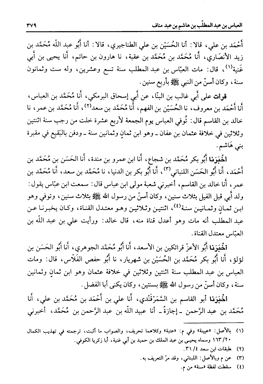 أحمد بن علي قالا أنا الحسين بن علي الطناجيري قالا أنا أبو عبد الله محمد بن زيد الأنصاري أنا محمد بن محمد بن عقبة نا هارون بن حاتم أنا يحيى بن أبي غنية (1) قال مات العباس بن عبد المطلب سنة تسع وعشرين وله ست وثمانون سنة وكان أسن من النبي (صلى الله عليه وسلم) بأربع سنين قرأت على أبي غالب بن البنا عن أبي إسحاق البرمكي أنا محمد بن العباس أنا أحمد بن معروف نا الحسين بن الفهم أنا محمد بن سعد (2) أنا محمد بن عمر نا خالد بن القاسم قال توفي العباس يوم الجمعة لأربع عشرة خلت من رجب سنة اثنتين وثلاثين في خلافة عثمان بن عفان وهو ابن ثمان وثمانين سنة ودفن بالبقيع في مقبرة بني هاشم أخبرنا أبو بكر محمد بن شجاع أنا ابن عمرو بن مندة أنا الحسن بن محمد بن أحمد أنا أبو الحسن اللنباني (3) أنا أبو بكر بن الدنيا نا محمد بن سعد أنا محمد بن عمر أنا خالد بن القاسم أخبرني شعبة مولى ابن عباس قال سمعت ابن عباس يقول ولد أبي قبل الفيل بثلاث سنين وكان أسن من رسول الله (صلى الله عليه وسلم) بثلاث سنين وتوفي وهو ابن ثمان وثمانين سنة (4) اثنتين وثلاثين وهو معتدل القناة وكان يخبرنا عن عبد المطلب أنه مات وهو أعدل قناة منه قال خالد ورأيت علي بن عبد الله بن العباس معتدل القناة أخبرنا أبو الأعز قراتكين بن الأسعد أنا أبو محمد الجوهري أنا أبو الحسن بن لؤلؤ أنا أبو بكر محمد بن الحسين بن شهريار نا أبو حفص الفلاس قال ومات العباس بن عبد المطلب سنة اثنتين وثلاثين في خلافة عثمان وهو ابن ثمان وثمانين سنة وكان أسن من رسول الله (صلى الله عليه وسلم) بسنتين وكان يكنى أبا الفضل أخبرنا أبو القاسم بن السمرقندي أنا علي بن أحمد بن محمد بن علي أنا محمد بن عبد الرحمن إجازة أنا عبيد الله بن عبد الرحمن بن محمد أخبرني