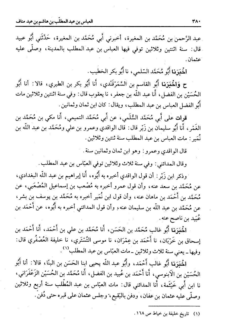 عبد الرحمن بن محمد بن المغيرة أخبرني أبي محمد بن المغيرة حدثني أبو عبيد قال سنة اثنتين وثلاثين توفي فيها العباس بن عبد المطلب بالمدينة وصلى عليه عثمان أخبرنا أبو محمد السلمي نا أبو بكر الخطيب ح وأخبرنا أبو القاسم بن السمرقندي أنا أبو بكر بن الطبري قالا أنا أبو الحسين بن الفضل أنا عبد الله بن جعفر نا يعقوب قال وفي سنة اثنتين وثلاثين مات أبو الفضل العباس بن عبد المطلب ويقال كان ابن ثمان وثمانين قرأت على أبي محمد السلمي عن أبي محمد التميمي أنا مكي بن محمد بن الغمر أنا أبو سليمان بن زبر قال قال الواقدي وعمرو بن علي ومحمد بن عبد الله بن نمير مات العباس بن عبد المطلب سنة ثنتين وثلاثين قال الواقدي وعمرو وهو ابن ثمان وثمانين سنة وقال المدائني وفي سنة ثلاث وثلاثين توفي العباس بن عبد المطلب وذكر ابن زبر أن قول الواقدي أخبره به أبوه أنا إبراهيم بن عبد الله البغدادي عن محمد بن سعد عنه وأن قول عمرو أخبره به مصعب بن إسماعيل المصعبي عن محمد بن أحمد بن ماهان عنه وأن قول ابن نمير أخبره به محمد بن يوسف بن بشر عن محمد بن عبد الله بن سليمان عنه وأن قول المدائني أخبره به أبوه عن أحمد بن عبيد بن ناصح عنه أخبرنا أبو غالب محمد بن الحسن أنا محمد بن علي بن أحمد أنا أحمد بن إسحاق بن خربان نا أحمد بن عمران نا موسى التستري نا خليفة العصفري قال وفيها يعني سنة ثلاث وثلاثين مات العباس بن عبد المطلب (1) أخبرنا أبو غالب أحمد وأبو عبد الله يحيى ابنا الحسن بن البنا قالا أنا أبو الحسين بن الآبنوسي أنا أحمد بن عبيد بن الفضل أنا محمد بن الحسين الزعفراني نا ابن أبي خيثمة أنا المدائني قال مات العباس بن عبد المطلب سنة أربع وثلاثين وصلى عليه عثمان بن عفان ودفن بالبقيع وجلس عثمان على قبره حتى دفن