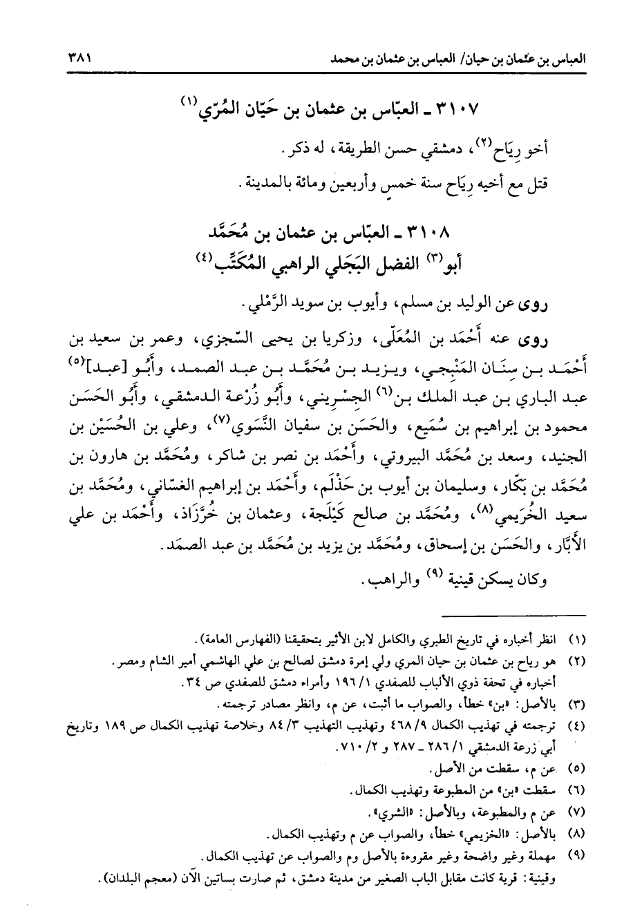 3108 - العباس بن عثمان بن محمد أبو (3) الفضل البجلي الراهبي المكتب (4) روى عن الوليد بن مسلم وأيوب بن سويد الرملي روى عنه أحمد بن المعلى وزكريا بن يحيى السجزي وعمر بن سعيد بن أحمد بن سنان المنبجي ويزيد بن محمد بن عبد الصمد وأبو عبد (5) عبد الباري بن عبد الملك بن (6) الجسريني وأبو زرعة الدمشقي وأبو الحسن