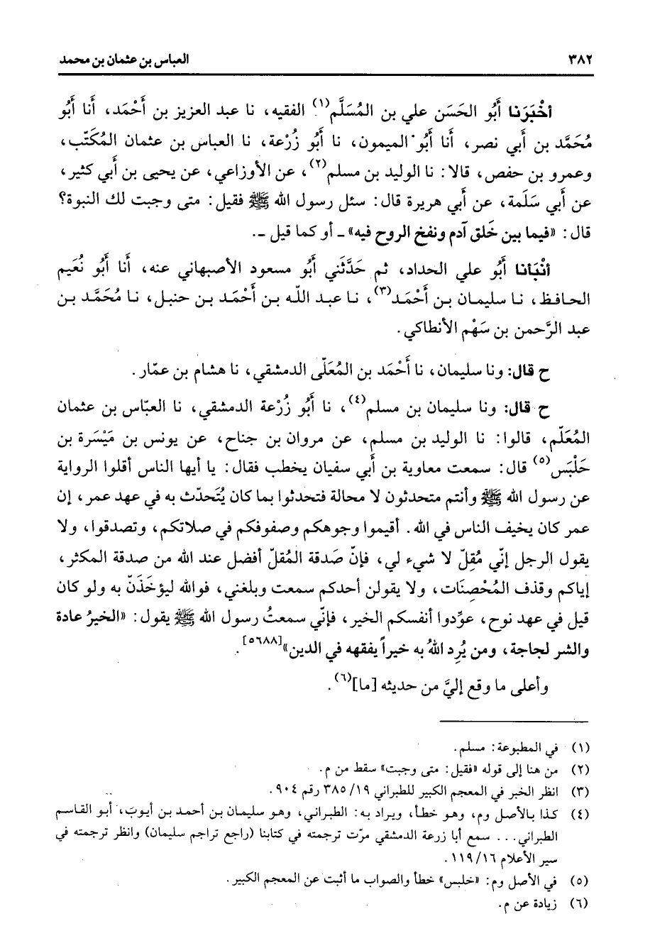 أخبرنا أبو الحسن علي بن المسلم (1) الفقيه نا عبد العزيز بن أحمد أنا أبو محمد بن أبي نصر أنا أبو الميمون نا أبو زرعة نا العباس بن عثمان المكتب وعمرو بن حفص قالا نا الوليد بن مسلم (2) عن الأوزاعي عن يحيى بن أبي كثير عن أبي سلمة عن أبي هريرة قال سئل رسول الله (صلى الله عليه وسلم) فقيل متى وجبت لك النبوة قال فيما بين خلق آدم ونفخ الروح فيه أو كما قيل أنبأنا أبو علي الحداد ثم حدثني أبو مسعود الأصبهاني عنه أنا أبو نعيم الحافظ نا سليمان بن أحمد (3) نا عبد الله بن أحمد بن حنبل نا محمد بن عبد الرحمن بن سهم الأنطاكي ح قال ونا سليمان نا أحمد بن المعلى الدمشقي نا هشام بن عمار ح قال ونا سليمان بن مسلم (4) نا أبو زرعة الدمشقي نا العباس بن عثمان المعلم قلاوا نا الوليد بن مسلم عن مروان بن جناح عن يونس بن ميسرة بن حلبس (5) قال سمعت معاوية بن أبي سفيان يخطب فقال يا أيها الناس أقلوا الرواية عن رسول الله (صلى الله عليه وسلم) وأنتم متحدثون لا محالة فتحدثوا بما كان يتحدث به في عهد عمر إن عمر كان يخيف الناس في الله أقيموا وجوهكم وصفوفكم في صلاتكم وتصدقوا ولا يقول الرجل إني مقل لا شئ لي فإن صدقة المقل أفضل عند الله من صدقة المكثر إياكم وقذف المحصنات ولا يقولن أحدكم سمعت وبلغني فوالله ليؤخذن به ولو كان قيل في عهد نوح عودوا أنفسكم الخير فإني سمعت رسول الله (صلى الله عليه وسلم) يقول الخير عادة والشر لجاجة ومن يرد به خيرا يفقهه في الدين