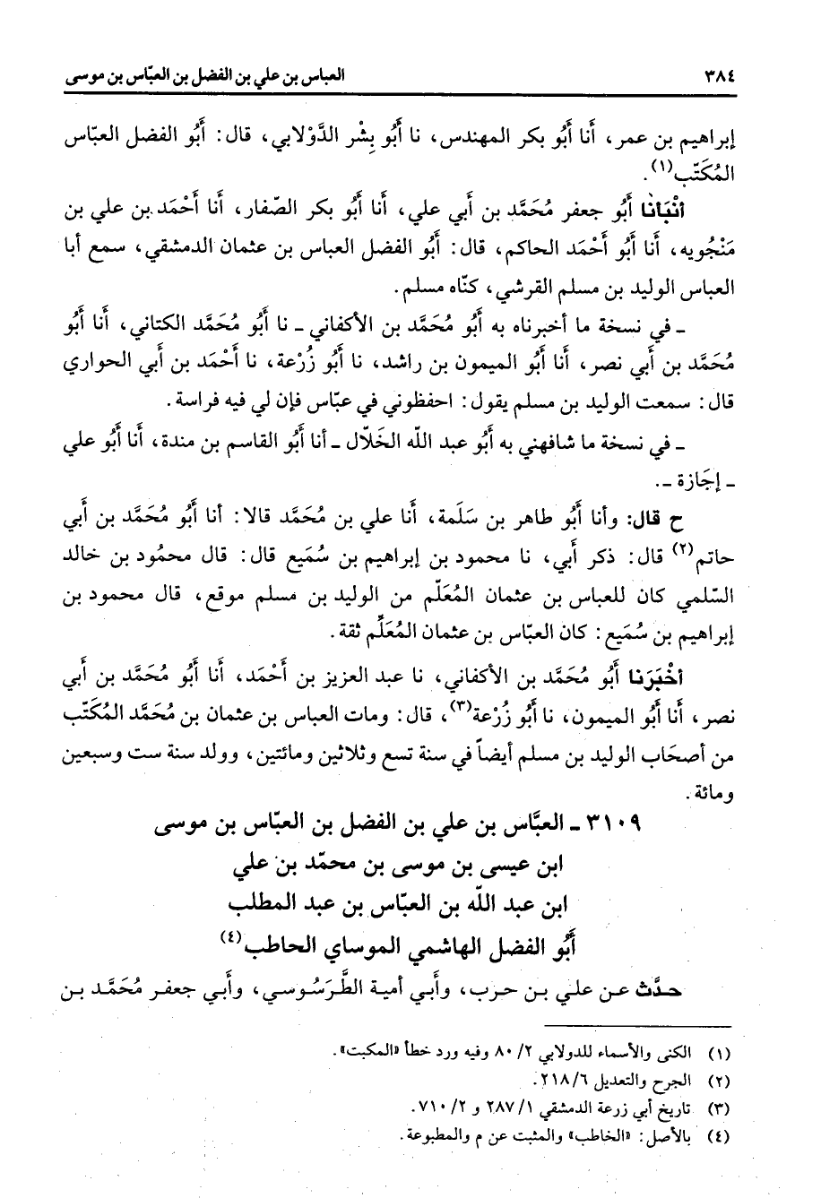 3109 - العباس بن علي بن الفضل بن العباس بن موسى ابن عيسى بن موسى بن محمد بن علي ابن عبد الله بن العباس بن عبد المطلب أبو الفضل الهاشمي الموساي الحاطب (4) حدث عن علي بن حرب وأبي أمية الطرسوسي وأبي جعفر محمد بن