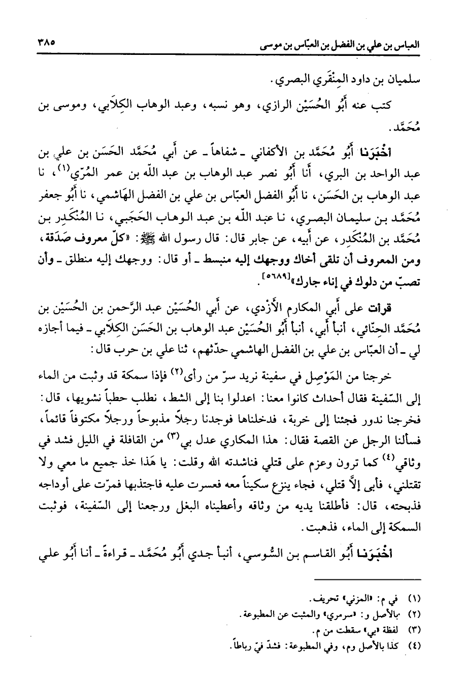 سليمان بن داود المنقري البصري كتب عنه أبو الحسين الرازي وهو نسبه وعبد الوهاب الكلابي وموسى بن محمد أخبرنا أبو محمد بن الأكفاني شفاها عن أبي محمد الحسن بن علي بن عبد الواحد بن البري أنا أبو نصر عبد الوهاب بن عبد الله بن عمر المري (1) نا عبد الوهاب بن الحسن نا أبو الفضل العباس بن علي بن الفضل الهاشمي نا أبو جعفر محمد بن سليمان البصري نا عبد الله بن عبد الوهاب الحجبي نا المكندر بن محمد بن المنكدر عن أبيه عن جابر قال قال رسول الله (صلى الله عليه وسلم) كل معروف صدقة ومن المعروف أن تلقى أخاك ووجهك إليه منبسط أو قال ووجهك إليه منطلق وأن تصب من دلوك في إناء جارك