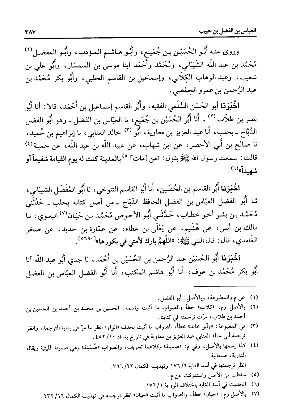 وروى عنه أبو الحسين بن جميع وأبو هاشم المؤدب وأبو المفضل (1) محمد بن عبد الله الشيباني ومحمد وأحمد ابنا موسى بن السمسار وأبو علي بن شعيب وعبد الوهاب الكلابي وإسماعيل بن القاسم الحلبي وأبو بكر محمد بن عبد الرحمن بن عمرو الحمصي أخبرنا أبو الحسن السلمي الفقيه وأبو القاسم إسماعيل بن أحمد قالا أنا أبو نصر بن طلاب (2) أنا أبو الحسين بن جميع نا العباس بن الفضل وهو أبو الفضل الدباج بحلب أنا عبد العزيز بن معاوية أبو (3) خالد العتابي نا إبراهيم بن حميد نا صالح بن أبي الأحضر عن ابن شهاب عن عبيد الله بن عبد الله عن حمينة (4) قالت سمعت رسول الله (صلى الله عليه وسلم) يقول من مات (5) بالمدينة كنت له يوم القيامة شفيعا أو شهيدا (6) أخبرنا أبو القاسم بن الحصين أنا أبو القاسم التنوخي نا أبو المفضل الشيباني ثنا أبو الفضل العباس بن الفضل الحافظ الدباج من أصل كتابه بحلب حدثني محمد بن بشر أخو خطاب حدثني أبو الأحوص محمد بن حيان (7) البغوي نا مالك بن أنس عن هشيم عن يعلى بن عطاء عن عمارة بن حديد عن صخر الغامدي قال قال النبي (صلى الله عليه وسلم) اللهم بارك لأمتي في بكورها