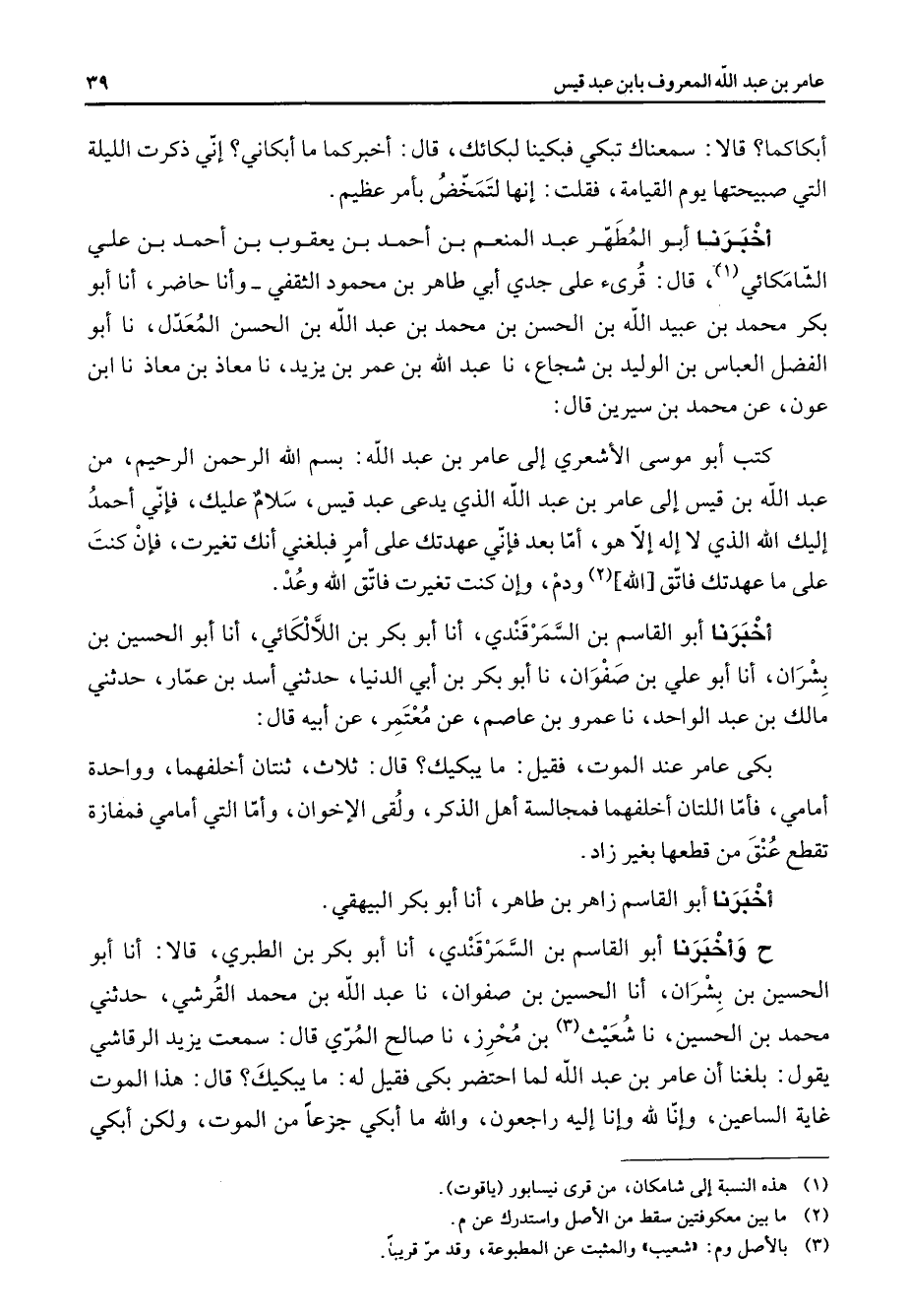 أبكاكما قالا سمعناك تبكي فبكينا لبكائك قال أخبركما ما أبكاني إني ذكرت الليلة التي صبيحتها يوم القيامة فقلت إنها لتمخض بأمر عظيم أخبرنا أبو المطهر عبد المنعم بن أحمد بن يعقوب بن أحمد بن علي الشامكائي (1) قال قرئ على جدي أبي طاهر بن محمود الثقفي وأنا حاضر أنا أبو بكر محمد بن عبيد الله بن الحسن بن محمد بن عبد الله بن الحسن المعدل نا أبو الفضل العباس بن الوليد بن شجاع نا عبد الله بن عمر بن يزيد نا معاذ بن معاذ نا ابن عون عن محمد بن سيرين قال كتب أبو موسى الأشعري إلى عامر بن عبد الله بسم الله الرحمن الرحيم من عبد الله بن قيس إلى عامر بن عبد الله الذي يدعى عبد قيس سلام عليك فإني أحمد إليك الله الذي لا إله إلا هو أما بعد فإني عهدتك على أمر فبلغني أنك تغيرت فإن كنت على ما عهدتك فاتق الله (2) ودم وإن كنت تغيرت فاتق الله وعد أخبرنا أبو القاسم بن السمرقندي أنا أبو بكر بن اللالكائي أنا أبو الحسين بن بشران أنا أبو علي بن صفوان نا أبو بكر بن أبي الدنيا حدثني أسد بن عمار حدثني مالك بن عبد الواحد نا عمرو بن عاصم عن معتمر عن أبيه قال بكى عامر عند الموت فقيل ما يبكيك قال ثلاث ثنتان اخلفهما وواحدة أمامي فأما اللتان أخلفهما فمجالسة أهل الذكر ولقى الإخوان وأما التي أمامي فمفازة تقطع عنق من قطعها بغير زاد أخبرنا أبو القاسم زاهر بن طاهر أنا أبو بكر البيهقي ح وأخبرنا أبو القاسم بن السمرقندي أنا أبو بكر بن الطبري قالا أنا أبو الحسين بن بشران أنا الحسين بن صفوان نا عبد الله بن محمد القرشي حدثني محمد بن الحسين نا شعيث (3) بن محرز نا صالح المري قال سمعت يزيد الرقاشي يقول بلغنا أن عامر بن عبد الله لما احتضر بكى فقيل له ما يبكيك قال هذا الموت غاية الساعين وإنا لله وإنا إليه راجعون والله ما أبكي جزعا من الموت ولكن أبكي