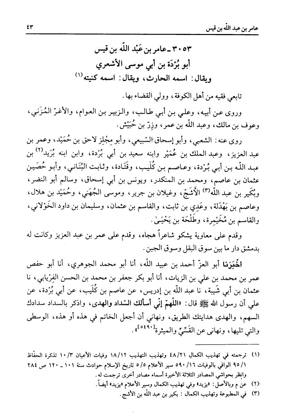 3053 - عامر بن عبد الله بن قيس أبو بردة بن أبي موسى الأشعري ويقال اسمه الحارث ويقال اسمه كنيته (1) تابعي فقيه من أهل الكوفة وولي القضاء بها وروى عن أبيه وعلي بن أبي طالب والزبير بن العوام والأغر المزني وعوف بن مالك وعبد الله بن عمر وزر بن حبيش وروى عنه الشعبي وأبو إسحاق السبيعي وأبو مجلز لاحق بن حميد وعمر بن