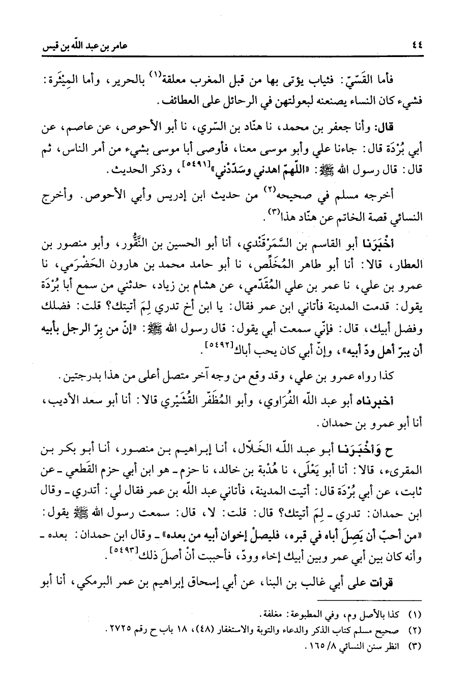 فأما القسي فثياب يؤتى بها من قبل المغرب معلقة (1) بالحرير وأما الميثرة فشئ كان النساء يصنعنه لبعولتهن في الرحائل على العطائف قال وأنا جعفر بن محمد نا هناد بن السري نا أبو الأحوص عن عاصم عن أبي بردة قال جاءنا علي وأبو موسى معنا فأوصى أبا موسى بشئ من أمر الناس ثم قال قال رسول الله (صلى الله عليه وسلم) اللهم اهدني وسددني وذكر الحديث أخرجه مسلم في صحيحه (2) من حديث ابن إدريس وأبي الأحوص وأخرج النسائي قصة الخاتم عن هناد هذا (3) أخبرنا أبو القاسم بن السمرقندي أنا أبو الحسين بن النقور وأبو منصور بن العطار قالا أنا أبو طاهر المخلص نا أبو حامد محمد بن هارون الحضرمي نا عمرو بن علي نا عمر بن علي المقدمي عن هشام بن زياد حدثني من سمع أبا بردة يقول قدمت المدينة فأتاني ابن عمر فقال يا ابن أخ تدري لم أتيتك قلت فضلك وفضل أبيك قال فإني سمعت أبي يقول قال رسول الله (صلى الله عليه وسلم) إن من بر الرجل بأبيه أن يبر أهل ود أبيه وإن أبي كان يحب أباك كذا رواه عمرو بن علي وقد وقع من وجه آخر متصل أعلى من هذا بدرجتين أخبرناه أبو عبد الله الفراوي وأبو المظفر القشيري قالا أنا أبو سعد الأديب أنا أبو عمرو بن حمدان ح وأخبرنا أبو عبد الله الخلال أنا إبراهيم بن منصور أنا أبو بكر بن المقرئ قالا أنا أبو يعلى نا هدبة بن خالد نا حزم هو ابن أبي حزم القطعي عن ثابت عن أبي بردة قال أتيت المدينة فأتاني عبد الله بن عمر فقال لي أتدري وقال ابن حمدان تدري لم أتيتك قال قلت لا قال سمعت رسول الله (صلى الله عليه وسلم) يقول من أحب أن يصل أباه في قبره فليصل إخوان أبيه من بعده وقال ابن حمدان بعده وأنه كان بين أبي عمر وبين أبيك إخاء وود فأحببت أن أصل ذلك قرأت على أبي غالب بن البنا عن أبي إسحاق إبراهيم بن عمر البرمكي أنا أبو