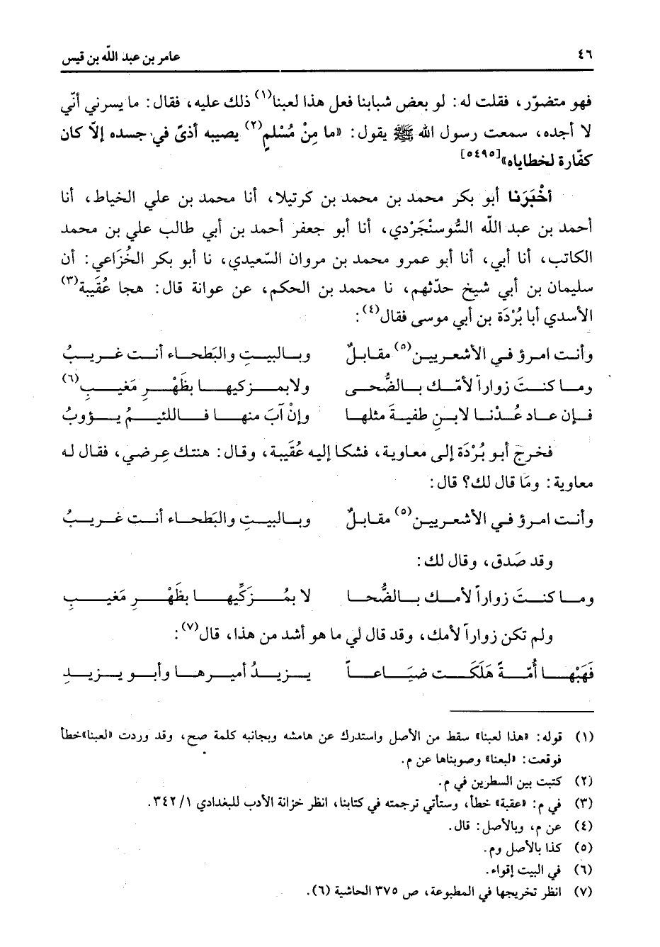 فهو متضور فقلت له لو بعض شبابنا فعل هذا لعبنا (1) ذلك عليه فقال ما يسرني أني لا أجده سمعت رسول الله (صلى الله عليه وسلم) يقول ما من مسلم (2) يصيبه أذى في جسده إلا كان كفارة لخطاياه أخبرنا أبو بكر محمد بن محمد بن كرتيلا أنا محمد بن علي الخياط أنا أحمد بن عبد الله السوسنجردي أنا أبو جعفر أحمد بن أبي طالب علي بن محمد الكاتب أنا أبي أنا أبو عمرو محمد بن مروان السعيدي نا أبو بكر الخزاعي إن سليمان بن أبي شيخ حدثهم نا محمد بن الحكم عن عوانة قال هجا عقيبة (3) الأسدي أبا بردة بن أبي موسى فقال (4) وأنت امرؤ في الأشعريين (5) مقابل * وبالبيت والبطحاء أنت غريب وما كنت زوارا لأمك بالضحى * ولا بمزكيها بظهر مغيب (6) فإن عاد عدنا لابن طفية مثلها * وإن آب منها فاللئيم يؤوب فخرج أبو بردة إلى معاوية فشكا إليه عقيبة وقال هنتك عرضي فقال له معاوية وما قال لك قال وانت امرؤ في الأشعريين (5) مقابل * وبالبيت والبطحاء أنت غريب وقد صدق وقال لك وما كنت زوارا لأمك بالضحا * لا بمزكيها بظهر مغيب ولم تكن زوارا لأمك وقد قال لي ما هو أشد من هذا قال (7) فهبها أمة هلكت ضياعا * يزيد أميرها وأبو يزيد
